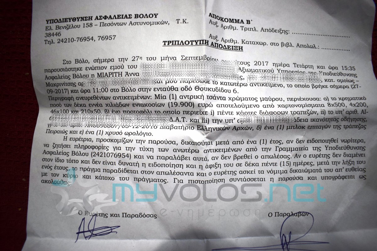 Στη συνέχεια, αυτοκίνητο της Ασφάλειας παρέλαβε από το καφέ την κα Μιαρίτη με την τσάντα και στο Αστυνομικό Μέγαρο έγινε καταμέτρηση του περιεχομένου, εντοπίστηκε ο επιχειρηματίας και ενημερώθηκε για την παραλαβή της, έκπληκτος καθώς δεν είχε αντιληφθεί την απώλεια της τσάντας, δύο περίπου ώρες μετά την αποχώρησή του από το καφέ.