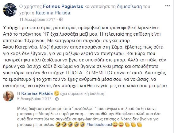 Αυτή τη φορά, το όνομά του έρχεται ξανά στη δημοσιότητα καθώς ο διαδικτυακός του πόλεμος με μία λιμενικό, την Κατερίνα Πλακίδα, έφτασε στη Δικαιοσύνη. Η λιμενικός έχει κάνει πολλές αναρτήσεις με χαρακτηρισμούς και υπονοούμενα εις βάρος του αστυνομικού. Οι ευαισθησίες του κ. Παγιαύλα για τα ανθρώπινα δικαιώματα και την προστασία των μειονοτήτων φαίνεται πως δεν βρίσκουν σύμφωνη την λιμενικό, η οποία σε πρόσφατη ανάρτηση αναφέρει πως ο αστυνομικόςσυχνάζει σε γκέι μπαρ εξαιτίας παλαιότερης συμμετοχής του στο Athens Pride. Με δική του ανάρτηση, εκείνος τη χαρακτηρίζει «τρανσφοβική» και εκείνη του έκανε μήνυση.