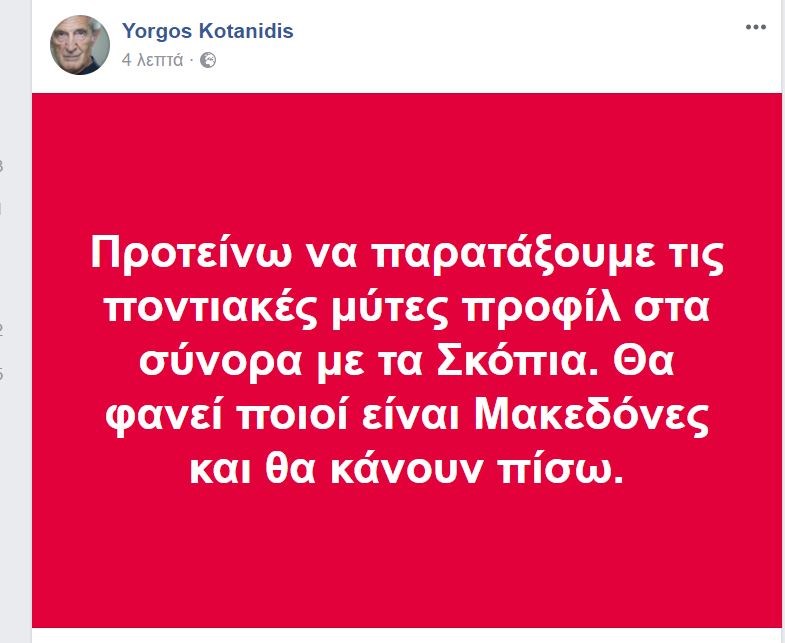 Την δική του πρόταση για την επίλυση του Σκοπιανού έκανε μέσω της προσωπικής του σελίδας στο Facebook, ο Γιώργος Κοτανίδης.