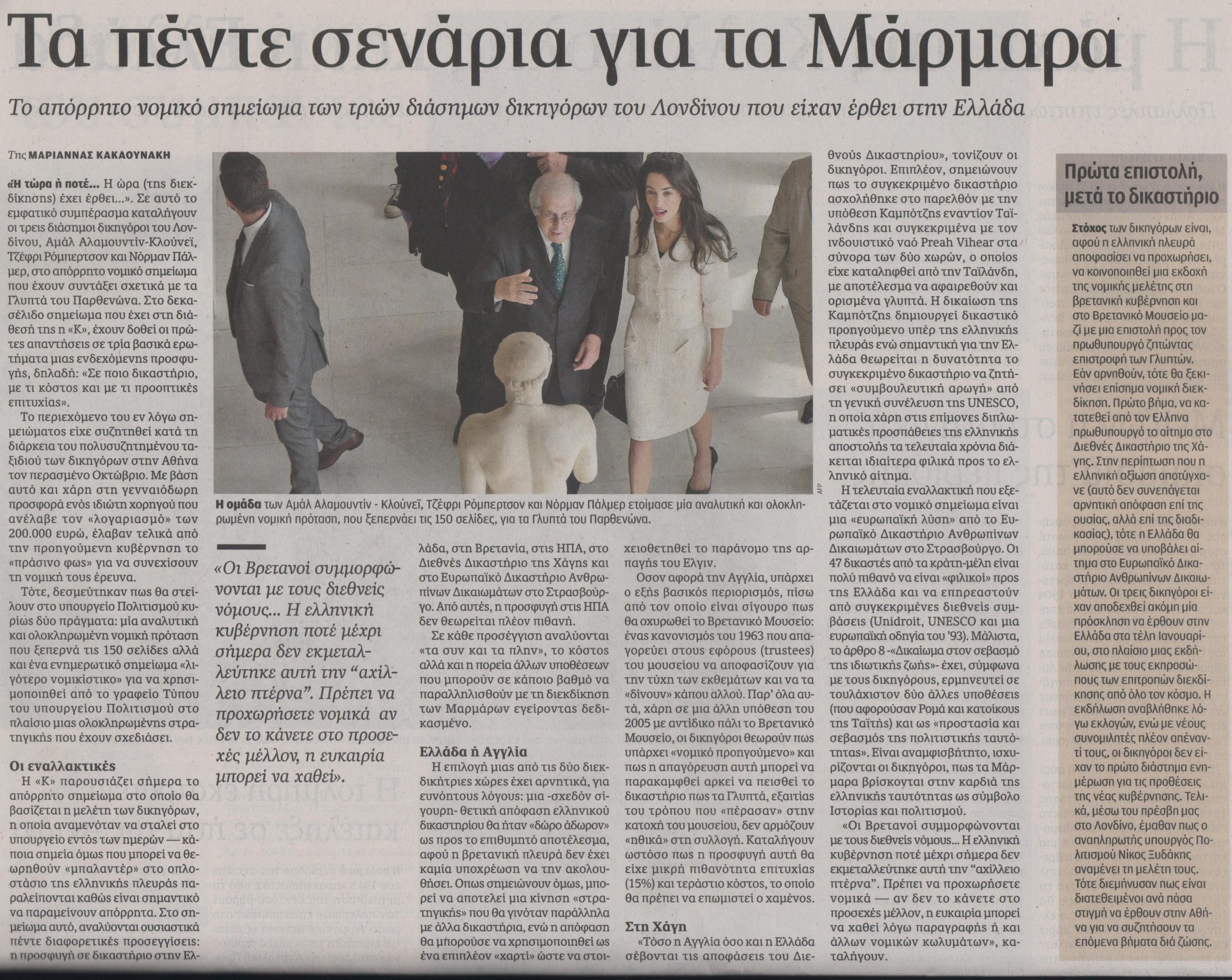 «Ή τώρα ή ποτέ… Η ώρα (της διεκδίκησης) έχει έρθει…». Σε αυτό το εμφατικό συμπέρασμα καταλήγουν οι τρεις διάσημοι δικηγόροι του Λονδίνου, Αμάλ Αλαμουντίν- Κλούνεϊ, Τζέφρι Ρόμπερτσον και Νόρμαν Πάλμερ, στο απόρρητο νομικό σημείωμα που έχουν συντάξει σχετικά με τα Γλυπτά του Παρθενώνα. Σε δεκασέλιδο σημείωμα έχουν δοθεί οι πρώτες απαντήσεις σε τρία βασικά ερωτήματα μιας ενδεχόμενης προσφυγής, δηλαδή: «Σε ποιο δικαστήριο, με τι κόστος και με τι προοπτικές επιτυχίας».