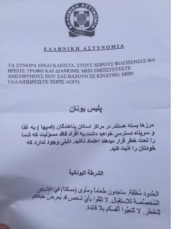 Η Ελληνική Αστυνομία με φυλλάδιο που μοιράζει στους πρόσφυγες που είναι εγκλωβισμένοι στην Ειδομένη, τους ενημερώνει ότι τα σύνορα είναι κλειστά και τους καλεί να πάνε στα κέντρα φιλοξενίας όπου υπάρχει τροφή. Παράλληλα, στην ανακοίνωση οι ελληνικές αρχές καλούν τους πρόσφυγες να μην εμπιστεύονται ανεύθυνους που τους βάζουν σε κίνδυνο.
