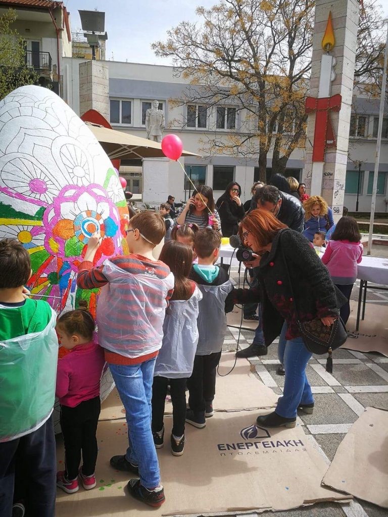 Είναι η πέμπτη χρονιά που πραγματοποιείται η συγκεκριμένη εκδήλωση στην πλατεία της Πτολεμαΐδας, με την εικαστικό να προετοιμάζει αρκετό καιρό πριν το τεράστιο πασχαλινό αυγό. Φροντίζει να επιδιορθώνει τις ζημιές, να το βάφει λευκό και να ετοιμάζει τα σχέδια και τα μοτίβα, πάνω στα οποία θα εκφραστούν με τις μπογιές τα μικρά παιδιά.