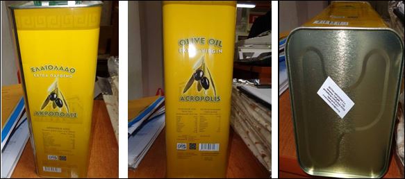 Πρόκειται για  το προϊόν το οποίο πωλείται ως “Εξαιρετικό Παρθένο Ελαιόλαδο”, με την εμπορική ονομασία «ΑΚΡΟΠΟΛΙΣ», «Ελληνικό Προϊόν», Lot No 1735, συσκευασίας των 5 λίτρων και αναγραφόμενη ημερομηνία στο λευκοσιδηρό δοχείο 30/12/2016, ενώ σε αυτοκόλλητη ετικέτα αναγράφονται οι ενδείξεις зехтин Акрополис 5л..,  Произход: Гърция, L 1749, дистрибутор «Cуити конс Еоод», години до: 04.2017, email: [email protected]. Το προϊόν πωλείται από το παντοπωλείο «ΛΕΩΝΙΔΟΥ ΑΝΑΣΤΑΣΙΑ», ΣΤΗΝ ΔΗΜΟΤΙΚΗ ΑΓΟΡΑ ΚΑΒΑΛΑΣ και αγοράσθηκε από την Βουλγαρία από την BEPTEKC фууд и дринkc еоод, Todor Alexandrov 21, 2700 Blagoergrad.