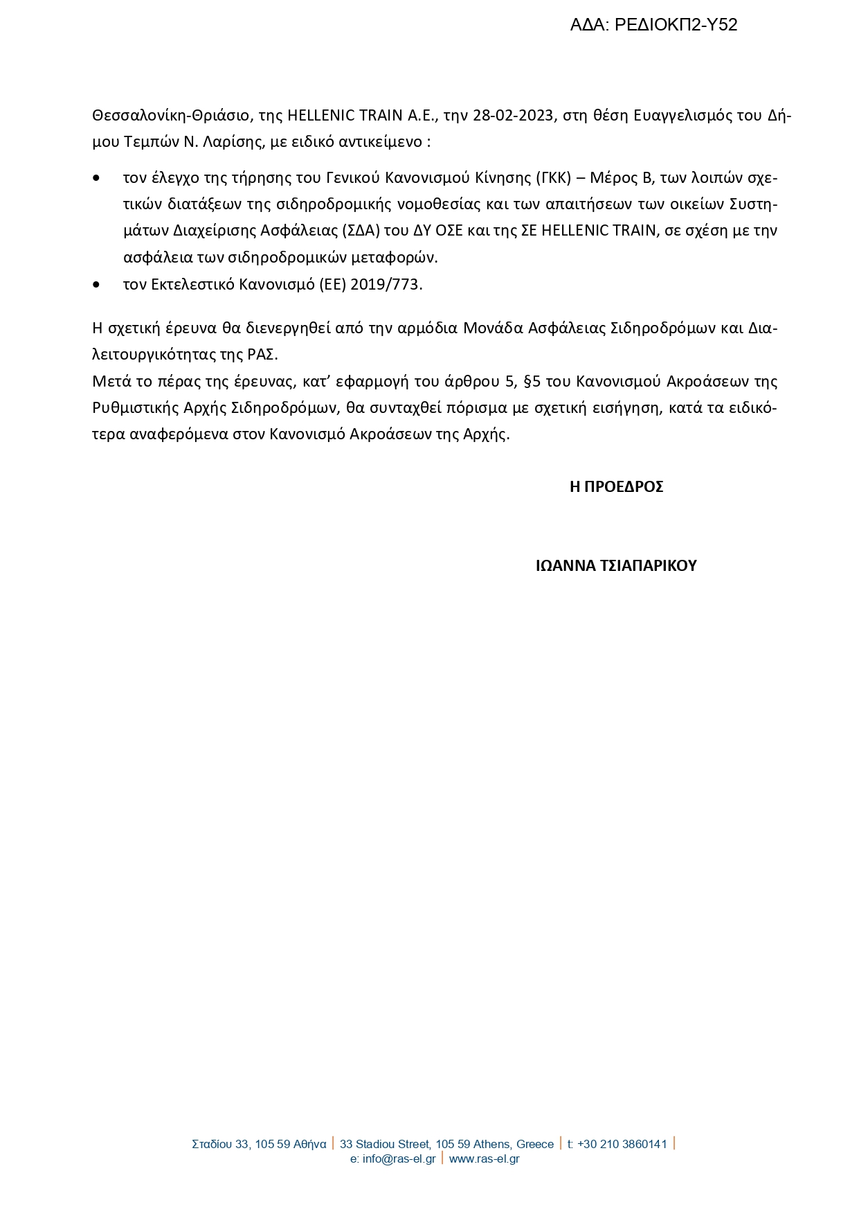 Η ΡΑΣ σε έκτακτη συνεδρίαση της Ολομέλειας την 1η Μαρτίου, αποφάσισε τη διεξαγωγή αυτεπάγγελτης έρευνας, βάσει του άρθρου 5 της υπ’αριθμ.1020/09.06.2021 Απόφασης της ΡΑΣ (Κανονισμός Ακροάσεων της ΡΑΣ), αναφορικά με την μετωπική σύγκρουση της επιβατικής αμαξοστοιχίας IC62 Αθήνα-Θεσσαλονίκη με την εμπορευματική αμαξοστοιχία 63503 Θεσσαλονίκη-Θριάσιο, της HELLENIC TRAIN A.E., την 28-02-2023, στη θέση Ευαγγελισμός του Δήμου Τεμπών Ν. Λαρίσης, με ειδικό αντικείμενο :