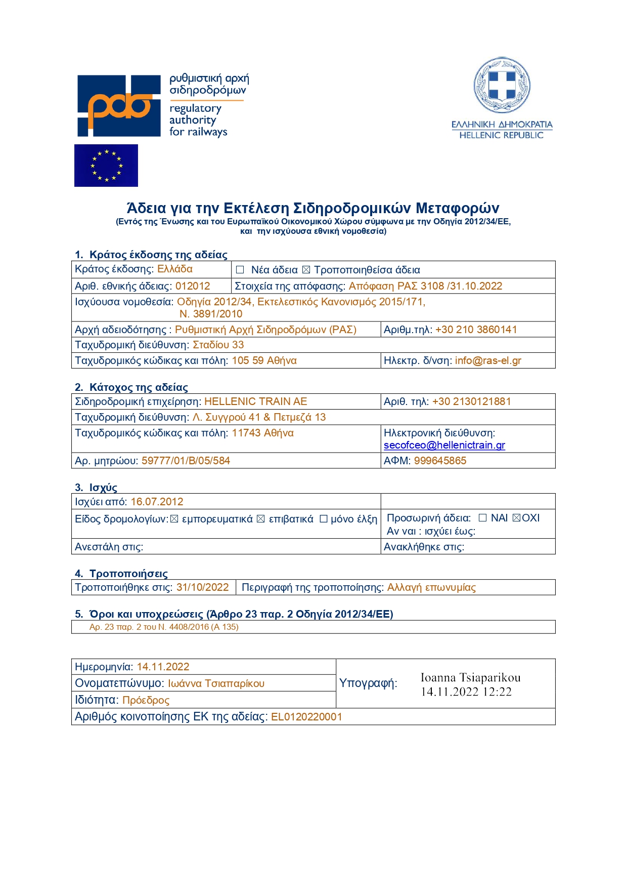 To πιστοποιητικό επικαιροποιήθηκε στις 6 Φεβρουαρίου, με τροποποίηση στην επωνυμία της επιχείρησης (στο αρχικό αναφερόταν ΤΡΑΙΝΟΣΕ και όχι Hellenic Train). Σε κάθε περίπτωση, έχει ισχύ έως τις 20 Δεκεμβρίου 2017.