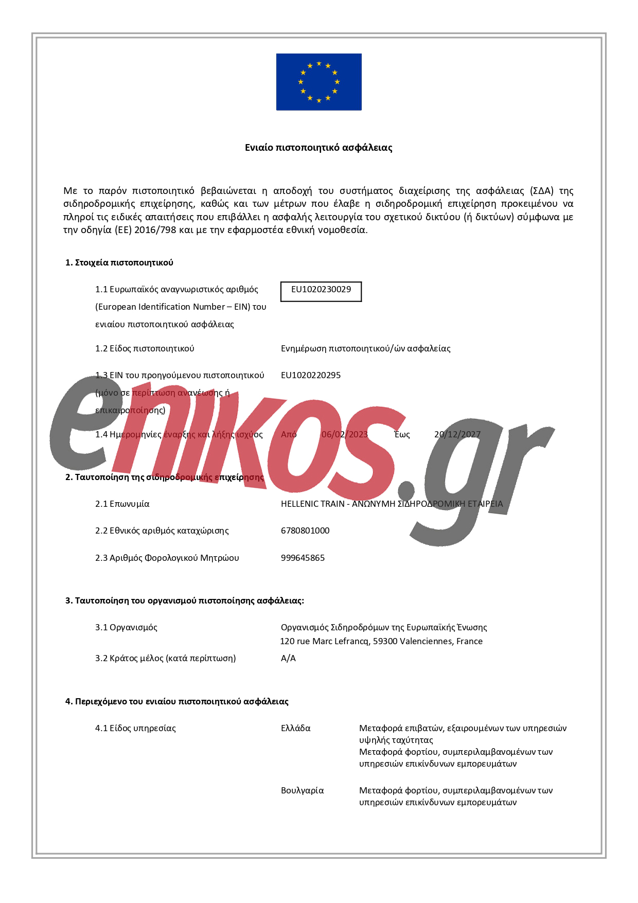 Το πιστοποιητικό Ασφαλείας της Hellenic Train