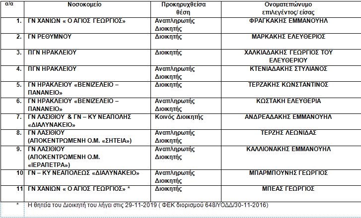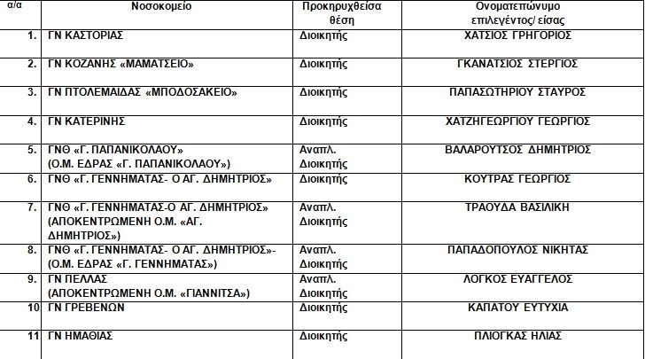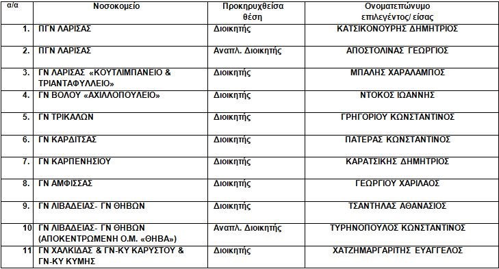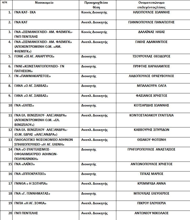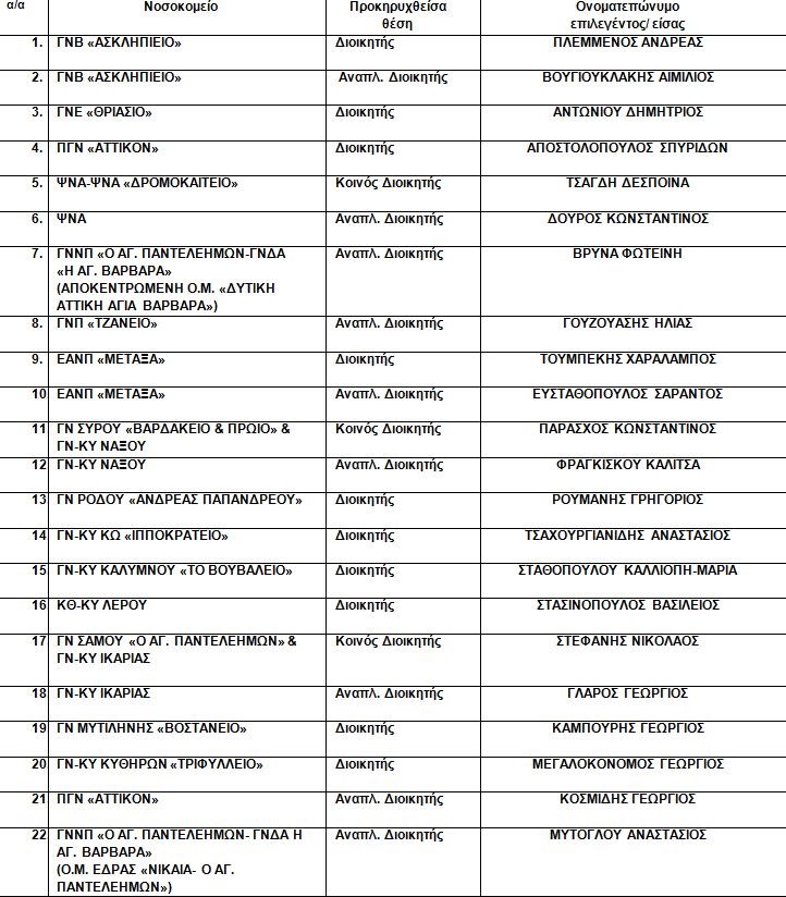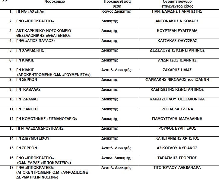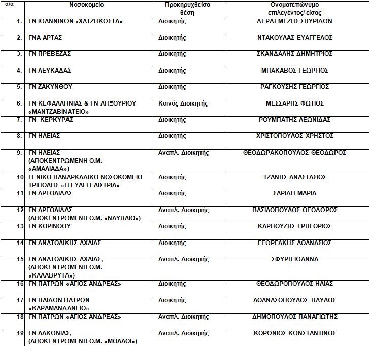 Επισυνάπτονται οι πίνακες, όπως ανακοινώθηκαν από το υπουργείο Υγείας ανά υγειονομική περιφέρεια, με τους διοικητές και υποδιοικητές που αναλαμβάνουν καθήκοντα στα νοσοκομεία.