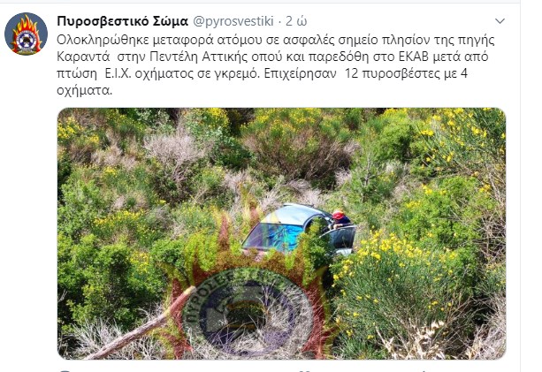 Σοβαρό τροχαίο σημειώθηκε, το πρωί του Σαββάτου, στην Πεντέλη, όταν ένα αυτοκίνητο που οδηγούσε ηλικιωμένος, έπεσε κάτω από αδιευκρίνιστες μέχρι στιγμής συνθήκες, σε γκρεμό 30 μέτρων στην περιοχή Καραντά. Άμεσα ενημερώθηκε η Πυροσβεστική και το ΕΚΑΒ. Οι πυροσβέστες κατάφεραν να απεγκλωβίσουν τον 80χρονο οδηγό από το όχημα ενώ στη συνέχεια το ασθενοφόρο τον μεταφέρθηκε στον Ερυθρό Σταυρό. Στο σημείο επιχείρησαν 12 πυροσβέστες με 4 οχήματα.
