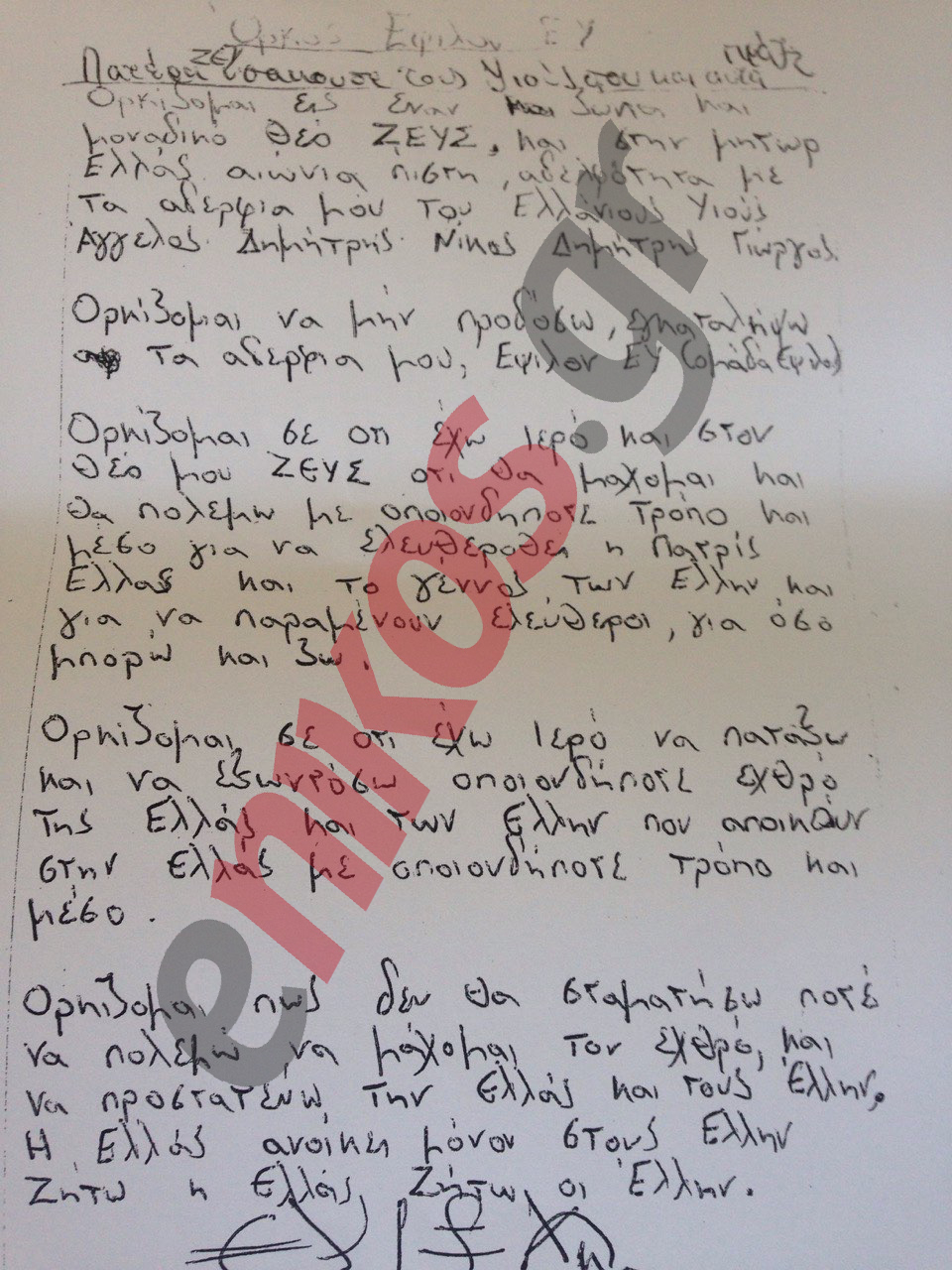 Οι «5» της ομάδας κρούσης δέθηκαν μεταξύ τους με όρκο σιωπής, με κεριά στο σκοτάδι ενός δωματίου της Δράμας, υποσχόμενοι αιώνια πίστη στον «Θεό Ζευ». Μέσα σε ένα ανορθόγραφο κείμενο με συντακτικά λάθη, ξεχωρίζει το ρήμα «εξοντώσω» που οι επαναστάτες καταγράφουν ως «εξωντόσω» και είναι η αρχή που υπαγορεύει τη δράση τους. «Ορκίζομαι σε ότι έχω ιερό και στον Θεό μου ΖΕΥΣ ότι θα μάχομαι και θα πολεμώ με οποιονδήποτε τρόπο και μέσο για να ελευθερωθεί η πατρίς Ελλάς και το γένος των Ελλην και για να παραμένουν ελεύθεροι για όσο μπορώ και ζω. Ορκίζομαι σε ότι έχω ιερό να πατάξω και να εξοντώσω οποιοδήποτε εχθρό της Ελλάς και τον Ελλην που αποικούν στην Ελλας με οποιοδήποτε τρόπο και μέσο».
