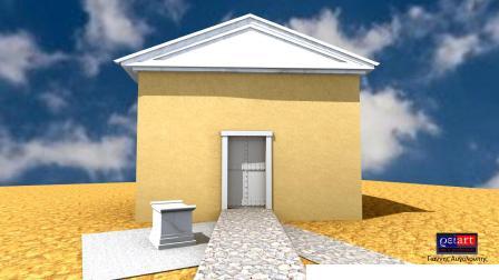 Ένας υπερυψωμένος, πομπικός (πλάτους δύο μέτρων), κτιστός δρόμος οδηγούσε σε είσοδο του μνημείου, που ήταν προσπελάσιμο για προσφορές και απονομή τιμών. Κινητά ευρήματα, κεραμική, περισσότερα από πενήντα νομίσματα χρονολογούν τάφο και βωμό στους χρόνους περίπου του Μεγάλου Αλεξάνδρου.