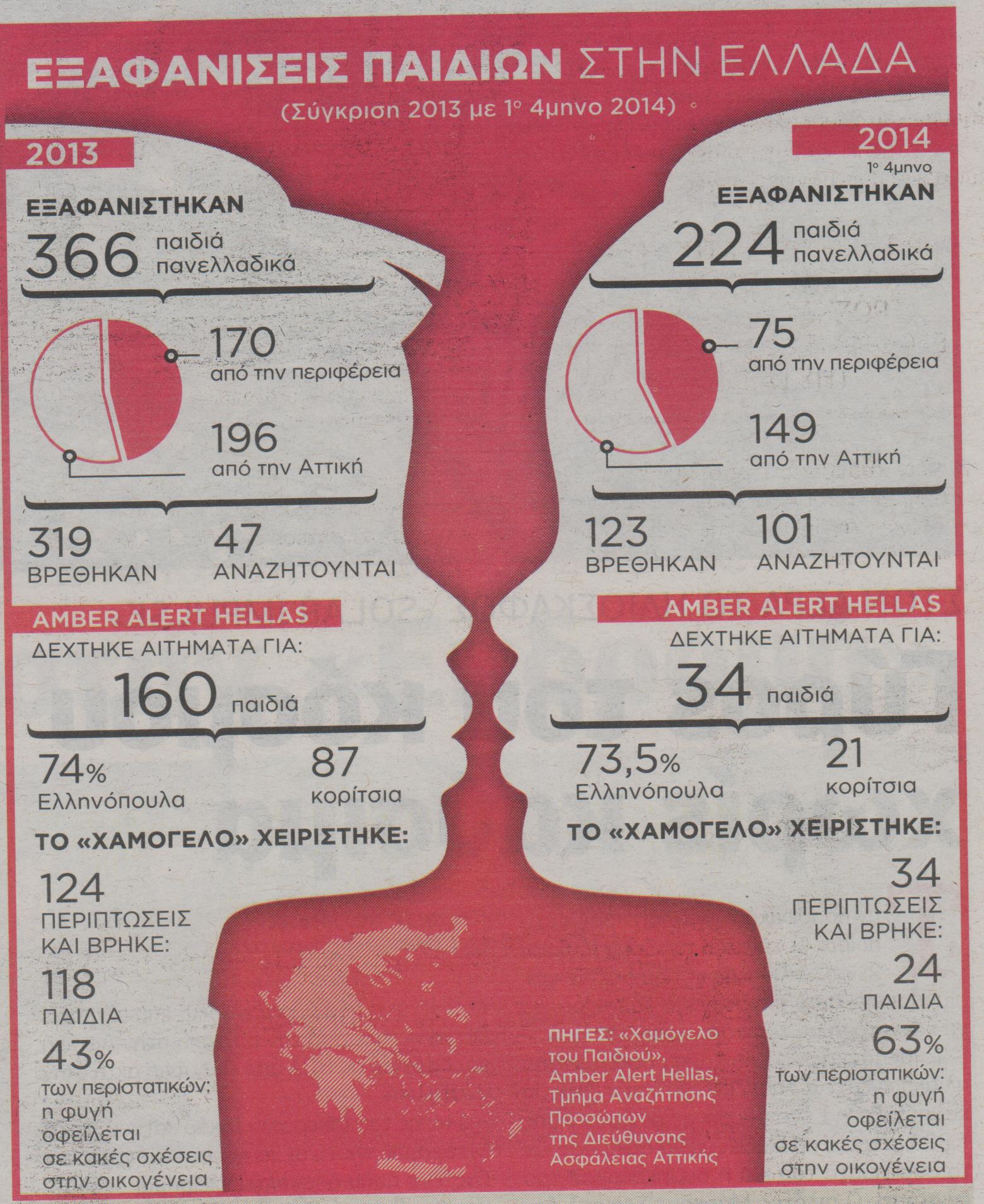 Όπως επισημαίνει ο υποδιευθυντής του τμήματος αναζήτησης προσώπων από τη Διεύθυνση Ασφάλειας Αττικής, κ. Χαράλαμπος Τρίγιας, το 2013 εξαφανίστηκαν 366 παιδιά πανελλαδικά, 196 από την Αττική και 170 από την περιφέρεια, ενώ το πρώτο 4μηνο του 2014 έχουν εξαφανιστεί 224 παιδιά, 149 από την Αττική και 75 από την περιφέρεια.