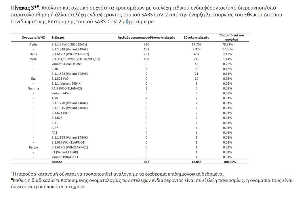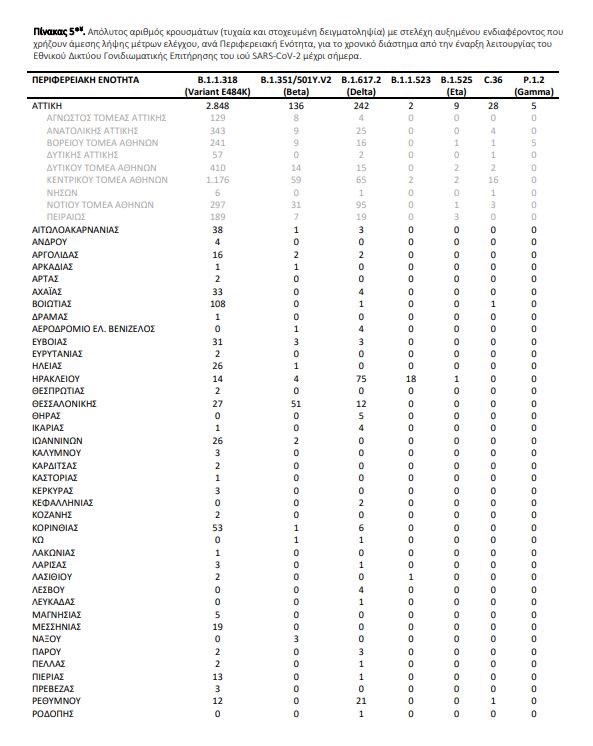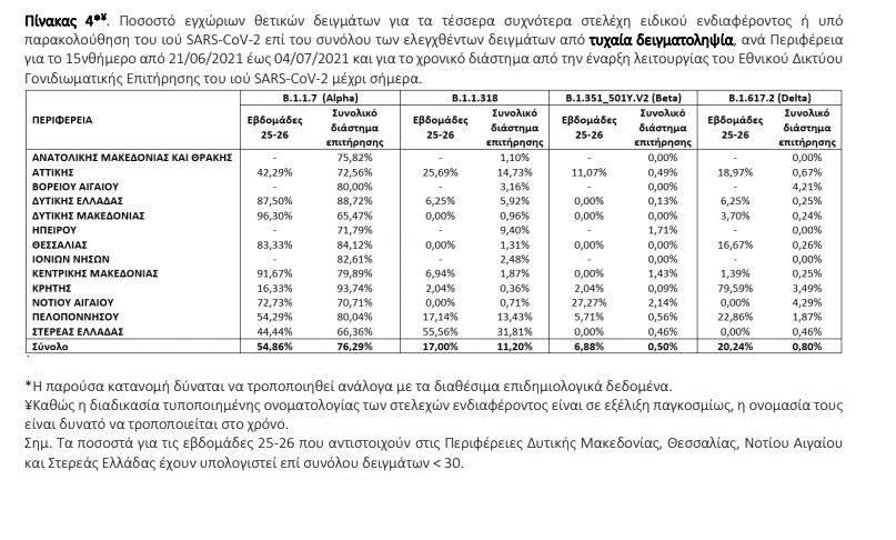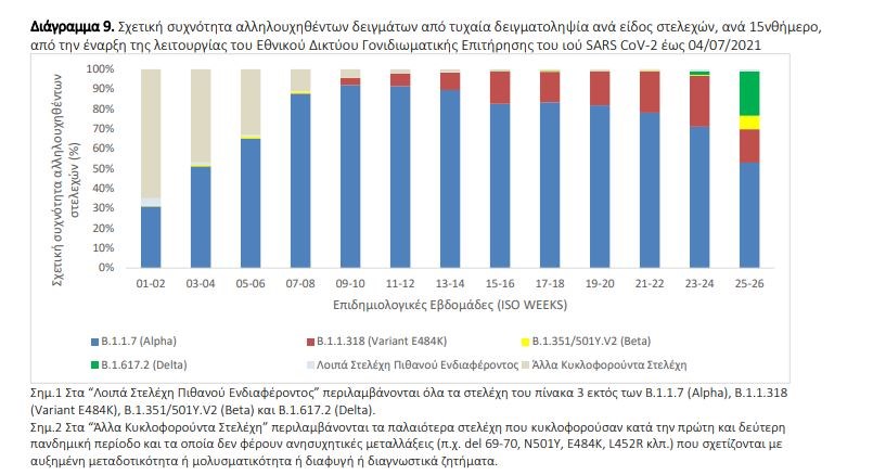 Ολοκληρώθηκε από το Eθνικό Δίκτυο Γονιδιωματικής Επιτήρησης του ιού SARS-CoV-2, που λειτουργεί υπό το συντονισμό του ΕΟΔΥ, η γονιδιωματική ανάλυση σε 892 δείγματα που έχουν επιλεγεί τυχαιοποιημένα ή στοχευμένα και αφορούν στην περίοδο 20 Μαΐου 2021 έως 07 Ιουλίου 2021 . Από τον έλεγχο των 892 δειγμάτων, αναδείχθηκαν συνολικά 703 δείγματα με στελέχη ειδικού ενδιαφέροντος (Variants Of Concern – VOC), και 174 δείγματα με στελέχη υπό παρακολούθηση (Variants Under Monitoring). Εκ των 703 δειγμάτων με στελέχη ειδικού ενδιαφέροντος, τα 320 αφορούν στο στέλεχος Alpha, 100 αφορούν στο Βeta, 281 αφορούν στο Delta και 2 αφορούν στο Gamma. Εκ των 174 δειγμάτων με στελέχη υπό παρακολούθηση, τα 168 αφορούν στο στέλεχος B.1.1.318 (Variant E484K), 4 αφορούν στο C.36 και 2 αφορούν στο Α.28 (Πίνακας 3). Από την έναρξη λειτουργίας του Εθνικού Δικτύου Γονιδιωματικής Επιτήρησης του ιού SARS-CoV-2 μέχρι σήμερα έχουν ελεγχθεί στην επικράτεια συνολικά 21.824 δείγματα από εγχώρια κρούσματα. Εξ αυτών 18.908 προέρχονται από τυχαία επιλογή δειγμάτων, 2.183 προέρχονται από στοχευμένη λήψη ή επιλογή δειγμάτων και για 733 δείγματα δεν είναι διαθέσιμος ο τρόπος επιλογής. Μεταξύ των 18.908 τυχαία επιλεγμένων δειγμάτων στην επικράτεια, τα τέσσερα πιο συχνά στελέχη ειδικού ενδιαφέροντος ή υπό παρακολούθηση που έχουν απομονωθεί είναι το Alpha, με ποσοστό 76,29%, ακολουθούμενο από το B.1.1.318 (Variant E484K) με ποσοστό 11,20%, το Delta με ποσοστό 0,80% και το Beta με ποσοστό 0,50% (Πίνακας 4). Η διαχρονική εξέλιξη της σχετικής συχνότητας των αλληλουχηθέντων δειγμάτων από τυχαία δειγματοληψία ανά είδος στελεχών, μέχρι και την εβδομάδα 26 απεικονίζεται στο Διάγραμμα 9. Από τα 2.183 δείγματα που έχουν ληφθεί ή επιλεγεί στοχευμένα, έχουν βρεθεί 2.021 στελέχη ειδικού ενδιαφέροντος ή υπό παρακολούθηση. Από τα δείγματα αυτά, 57,58% αφορούν στο στέλεχος B.1.1.318 (Variant E484K), 18,92% στο Alpha, 10,08% στο Delta, 5,73% στο Beta, 0,18% στο C.36 και 0,09% στο Gamma. Επιπλέον, έχουν απομονωθεί συνολικά 158 στελέχη ειδικού ενδιαφέροντος ή υπό παρακολούθηση ή ενδιαφέροντος από δείγματα εισαγόμενων κρουσμάτων, εκ των οποίων 109 αφορούν στο Alpha, 34 στο Delta, 5 στο Beta, 4 στο Β.1.1.318 (Variant E484K), 2 στο B.1.621 (VOI), 1 στο Eta, 1 στο Kappa, 1 στο C.36, και 1 στο B.1.623. Όσον αφορά στα στελέχη ενδιαφέροντος που χρήζουν άμεσης λήψης μέτρων ελέγχου επί του παρόντος στη χώρα, η γεωγραφική κατανομή ανά Περιφερειακή Ενότητα παρουσιάζεται στον πίνακα 5.