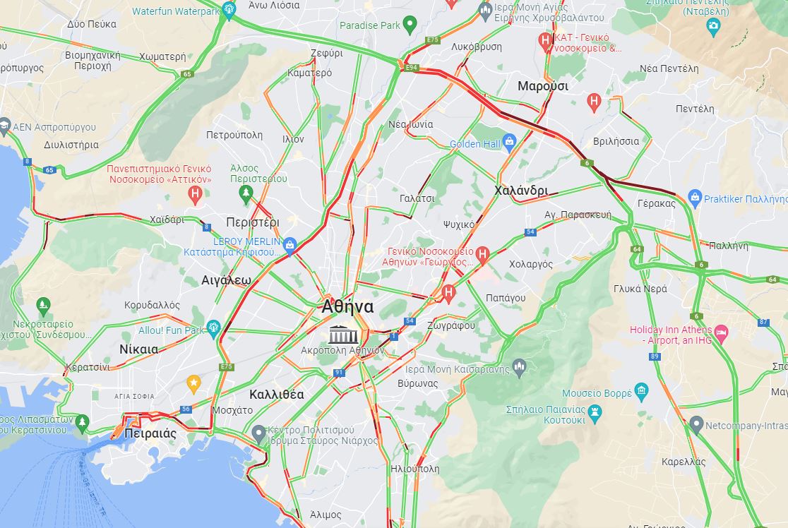 Ιδιαίτερα αυξημένη είναι η κίνηση αυτήν την ώρα σε κεντρικούς δρόμους της Αττικής. Προβλήματα εντοπίζονται στον Κηφισό, στο κέντρο της Αθήνας, στην Παραλιακή, καθώς και στο λιμάνι του Πειραιά.