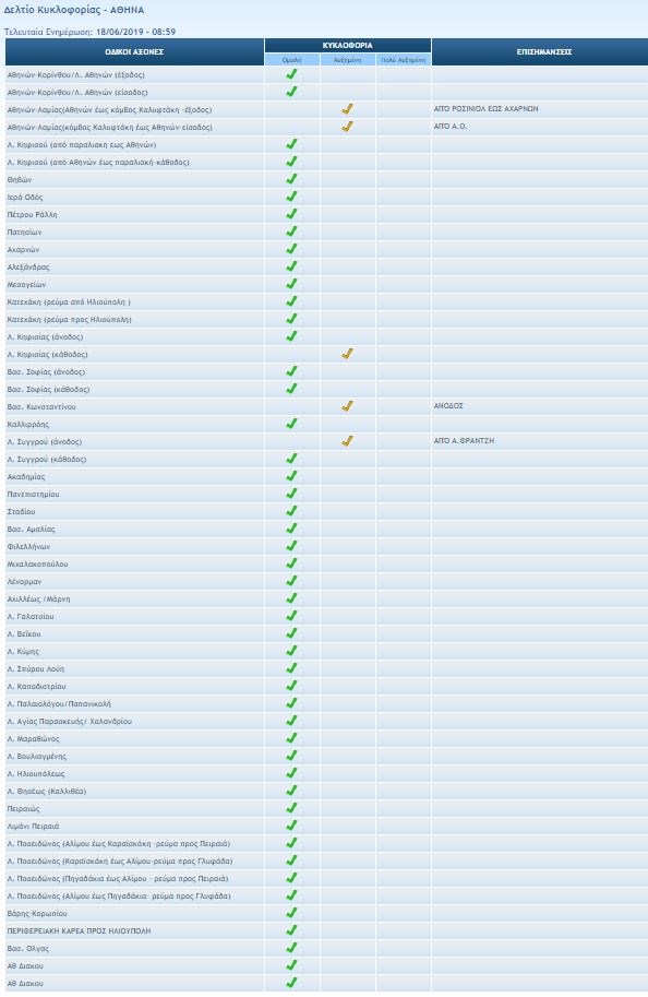 Σύμφωνα με την ενημέρωση από την Τροχαία αυξημένη κίνηση παρατηρείται στα εξής σημεία: Αθηνών – Λαμίας (Αθηνών έως κόμβος Καλυφτάκη – έξοδος) από Ροσινιόλ έως Αχαρνών, Αθηνών – Λαμίας (κόμβος Καλυφτάκη έως Αθηνών-είσοδος) από Αττική Οδό, Λ. Κηφισίας (κάθοδος), Βασ. Κωνσταντίνου (άνοδος), Λ. Συγγρού (άνοδος) από Φραντζή.