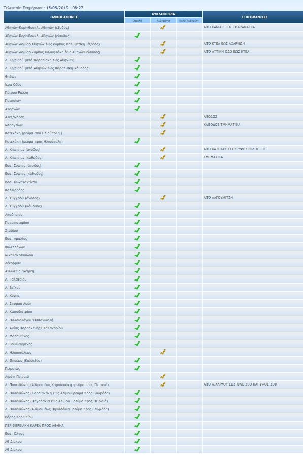 Σύμφωνα με την ενημέρωση από την Τροχαία αυξημένη κίνηση παρατηρείται στα εξής σημεία: Αθηνών – Κορίνθου/Λ. Αθηνών (έξοδος) από Χαϊδάρι έως Σκαραμαγκά, Αθηνών – Λαμίας (Αθηνών έως κόμβος Καλυφτάκη – έξοδος) από ΚΤΕΛ έως Αχαρνών, Αθηνών – Λαμίας (κόμβος Καλυφτάκη έως Αθηνών – είσοδος) από Αττική Οδό έως ΚΤΕΛ, Αλεξάνδρας (άνοδος), Μεσογείων (κάθοδος), Λ. Κηφισίας (άνοδος) από Κατεχάκη έως το ύψος της Φιλοθέης, Λ. Κηφισίας (κάθοδος), Λ. Συγγρού (άνοδος) από Λαγουμιτζή, Λ. Ηλιουπόλεως, Λιμάνι Πειραιά, Λ. Ποσειδώνος (Αλίμου έως Καραϊσκάκη – ρεύμα προς Πειραιά) από Λ. Αλίμου έως Φλοίσβο και ύψος ΣΕΦ.