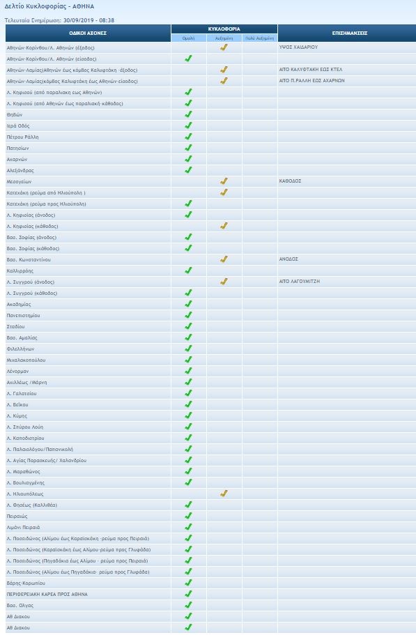 Σύμφωνα με την ενημέρωση από την Τροχαία αυξημένη κίνηση παρατηρείται στα εξής σημεία: Αθηνών – Κορίνθου/Λ. Αθηνών (έξοδος) ύψος Χαϊδαρίου, Αθηνών – Λαμίας (Αθηνών έως κόμβος Καλυφτάκη – έξοδος) από Καλυφτάκη έως ΚΤΕΛ, Αθηνών – Λαμίας (κόμβος Καλυφτάκη έως Αθηνών -είσοδος) από Πέτρου Ράλλη έως Αχαρνών, Μεσογείων (κάθοδος), Κατεχάκη (ρεύμα από Ηλιούπολη), Λ. Κηφισίας (κάθοδος), Βασ. Κωνσταντίνου (άνοδος), Λ. Συγγρού (άνοδος) από Λαγουμιτζή, Λ. Ηλιουπόλεως.