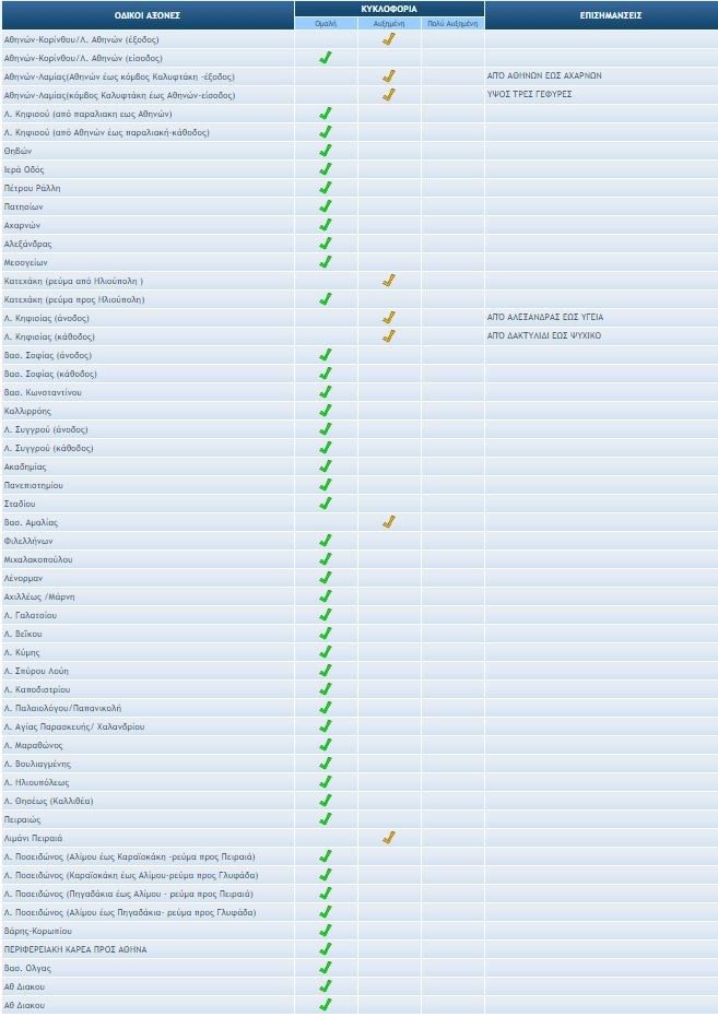 Σύμφωνα με την ενημέρωση από την Τροχαία αυξημένη κίνηση παρατηρείται στα εξής σημεία: Αθηνών – Κορίνθου/Λ. Αθηνών (έξοδος), Αθηνών – Λαμίας (Αθηνών έως κόμβος Καλυφτάκη – έξοδος) από Αθηνών έως Αχαρνών, Αθηνών – Λαμίας (κόμβος Καλυφτάκη έως Αθηνών – είσοδος) ύψος Τρεις Γέφυρες, Κατεχάκη (ρεύμα από Ηλιούπολη), Λ. Κηφισίας (άνοδος) από Αλεξάνδρας έως Υγεία, Λ. Κηφισίας (κάθοδος) από Δαχτυλίδι έως Ψυχικό, Βασ. Αμαλίας, Λιμάνι Πειραιά.