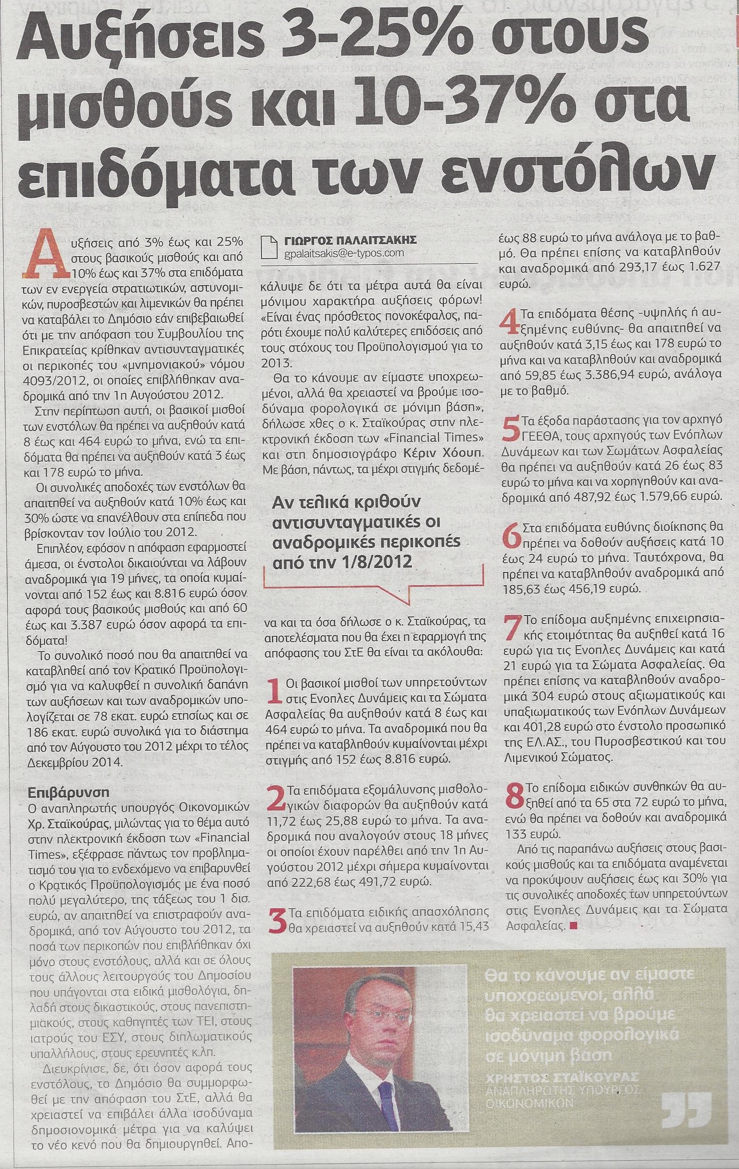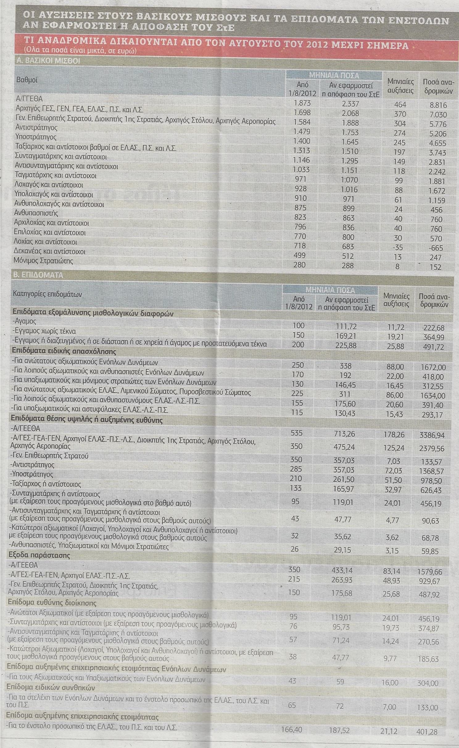 Αυξήσεις από 3% έως και 25% στους βασικούς μισθούς και από 10% έως και 37% στα επιδόματα των εν ενεργεία στρατιωτικών, αστυνομικών, πυροσβεστών και λιμενικών θα πρέπει να καταβάλει το δημόσιο, σύμφωνα με τον “Ελεύθερο Τύπο”, εάν επιβεβαιωθεί ότι με την απόφαση του Συμβουλίου της Επικρατείας κρίθηκαν αντισυνταγματικές οι περικοπές του “μνημονιακού” νόμου 4093/2012, οι οποίες επιβλήθηκαν αναδρομικά από την 1η Αυγούστου 2012.