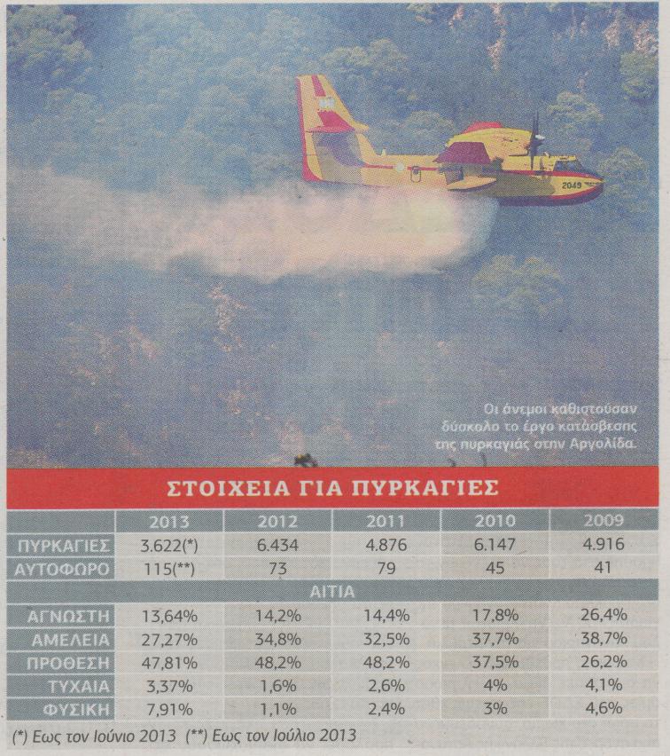 Όπως είχε ενημερώσει λίγες μέρες πριν και ο υπουργός Προστασίας του Πολίτη κ. Νίκος Δένδιας, με βάση τα ίδια στοιχεία προκύπτει ότι μία στις δύο πυρκαγιές που έχουν εκδηλωθεί μέσα στο 2013 μέχρι και το τέλος Ιουλίου είναι από πρόθεση. Βέβαια, όπως διευκρινίζει η Πυροσβεστική Υπηρεσία, το ποσοστό αυτό αφορά σε δικογραφίες, μιας και το αντίστοιχο για καταδικαστικές αποφάσεις εμπρηστικών ενεργειών πέφτει στο 13%-14%, που είναι και ο ευρωπαϊκός μέσος όρος.