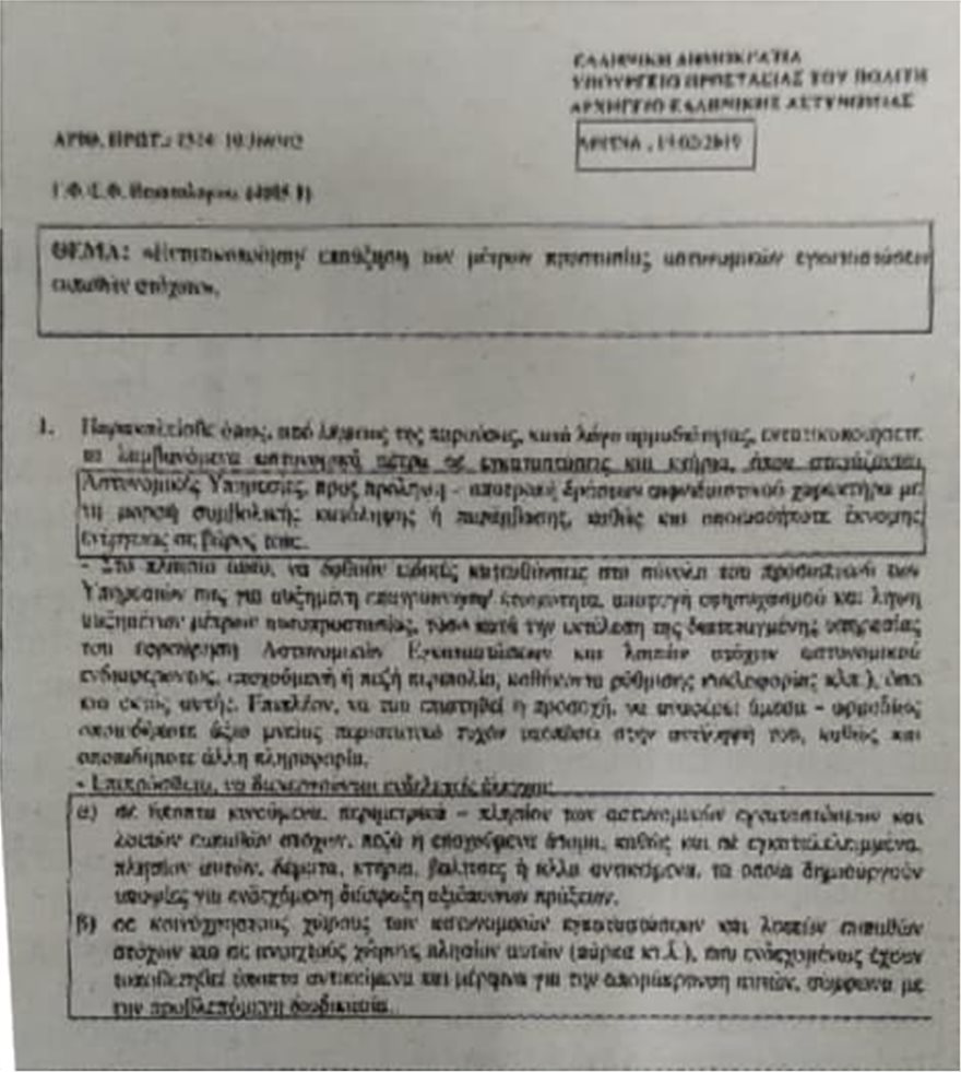 Στο έγγραφο που παρουσιάζει η εφημερίδα ”τα ΝΕΑ”, τονίζεται προς τις αστυνομικές υπηρεσίες «παρακαλείσθε όπως εντατικοποιήσετε τα λαμβανόμενα αστυνομικά μέτρα σε εγκαταστάσεις και κτήρια όπου στεγάζονται αστυνομικές υπηρεσίες προς πρόληψη-αποτροπή δράσεων αφνιδιαστικού χαρακτήρα με τη μορφή συμβολικής κατάληψης ή παρέμβασης, καθώς και οποιασδήποτε έκνομης ενέργειας εις βάρος τους».