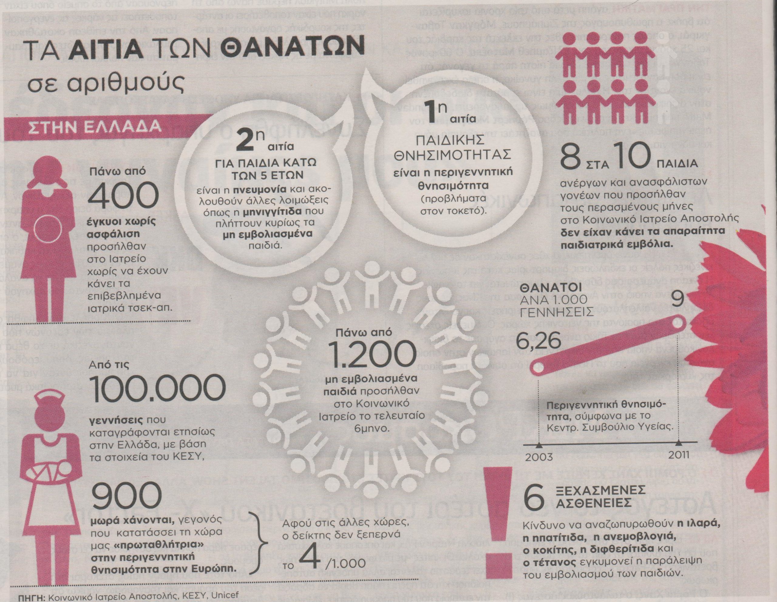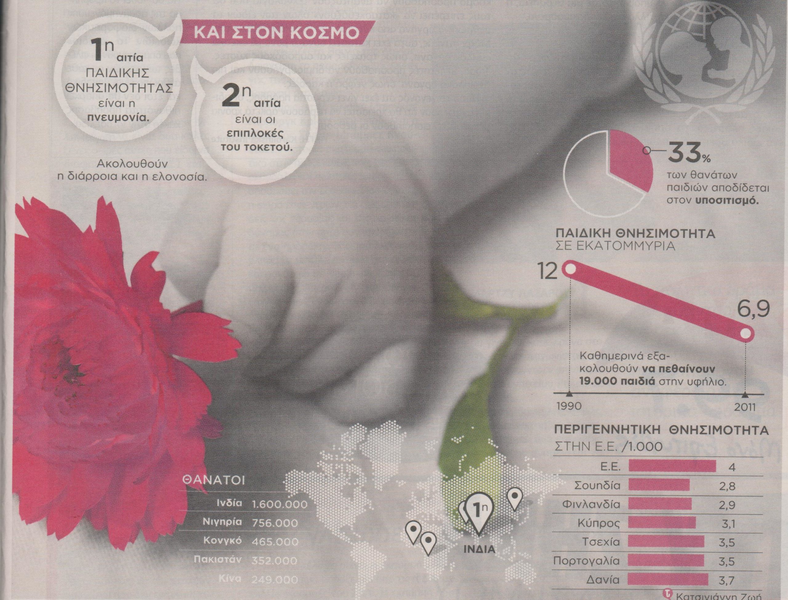 Aνοιχτή πληγή παραμένει στη χώρα μας και παγκοσμίως η παιδική θνησιμότητα, παρότι την τελευταία εικοσαετία καταγράφηκε μεγάλη μείωση των θανάτων σε βρέφη, νήπια και παιδιά, κυρίως χάρη στην ανάπτυξη των εμβολίων και τη βελτίωση των συνθηκών ζωής και των συνθηκών υγιεινής στα νοσοκομεία.Ωστόσο, όπως φανερώνει η έκθεση της Unicef, παραμένει υψηλός ο αριθμός των παιιδών κάτω των 5 ετών που εξακολουθούν να πεθαίνουν καθημερινά, όχι μόνο στην άλλη άκρη του πλανήτη αλλά και στην πατρίδα μας, με την πνευμονία να αποτελεί το 1ο έτος παιδικής θνησιμότητας, παγκοσμίως, και τις επιπλοκές στον τοκετό να ακολουθούν.Ειδικότερα στη χώρα μας δεν υπάρχει περιθώριο εφησυχασμού, καθώς τα στοιχεία μαρτυρούν αύξηση της παιδικής θνησιμότητας την τελευταία διετία και αναστροφή της καλής εικόνας που είχε επιτευχθεί μέχρι το 2007.ΠΑΤΗΣΤΕ ΕΠΑΝΩ ΣΤΙΣ ΦΩΤΟΓΡΑΦΙΕΣ ΓΙΑ ΜΕΓΑΛΥΤΕΡΗ ΑΝΑΛΥΣΗ