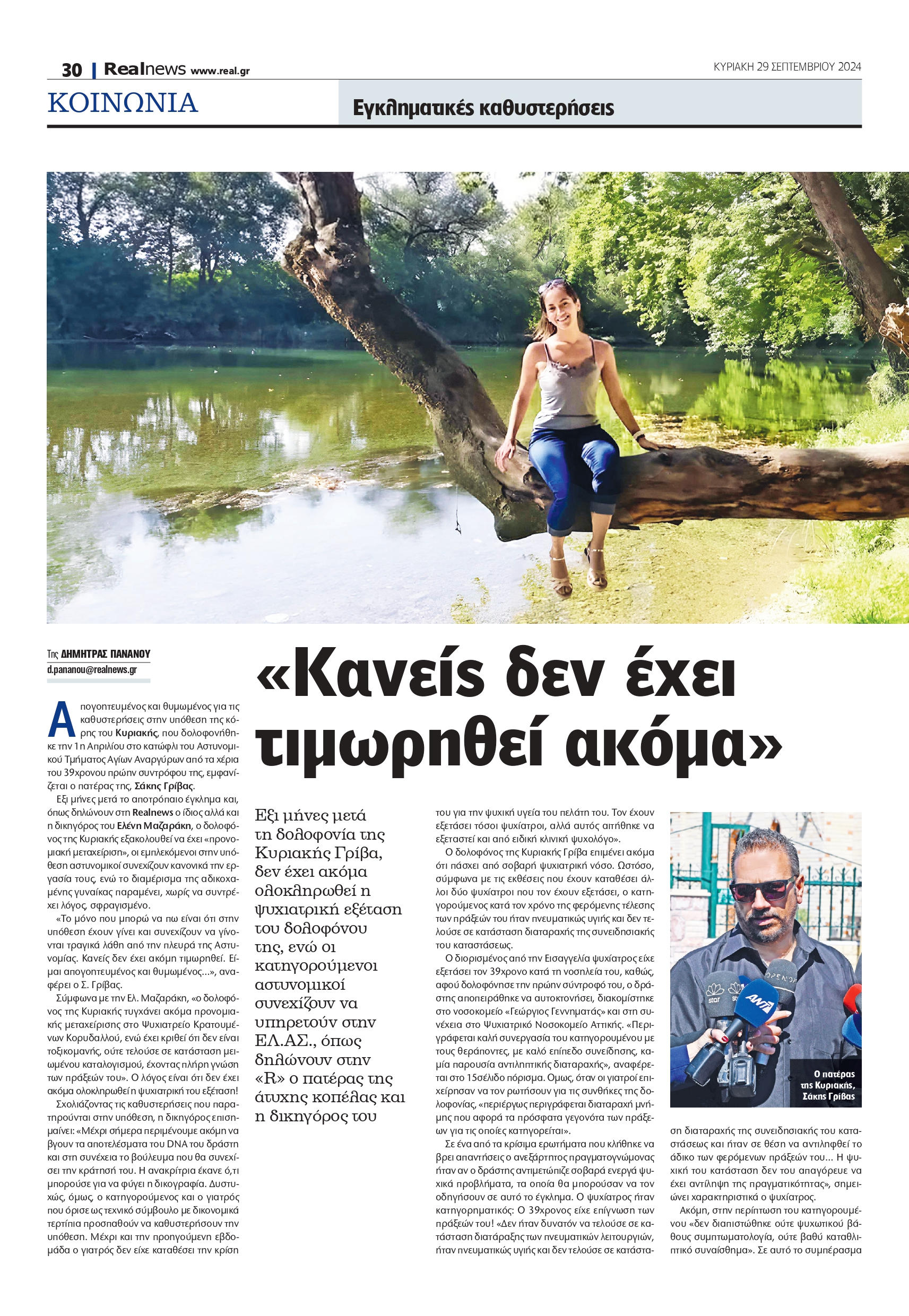 Έξι μήνες μετά τη δολοφονία της Κυριακής Γρίβα, ο πατέρας της δηλώνει στην «R» ότι οι κατηγορούμενοι αστυνομικοί εξακολουθούν να υπηρετούν στην ΕΛ.ΑΣ. Απογοητευμένος και θυμωμένος για τις καθυστερήσεις στην υπόθεση της κόρης του Κυριακής, που δολοφονήθηκε την 1η Απριλίου στο κατώφλι του Αστυνομικού Τμήματος Αγίων Αναργύρων από τα χέρια του 39χρονου πρώην συντρόφου της, εμφανίζεται ο πατέρας της, Σάκης Γρίβας.