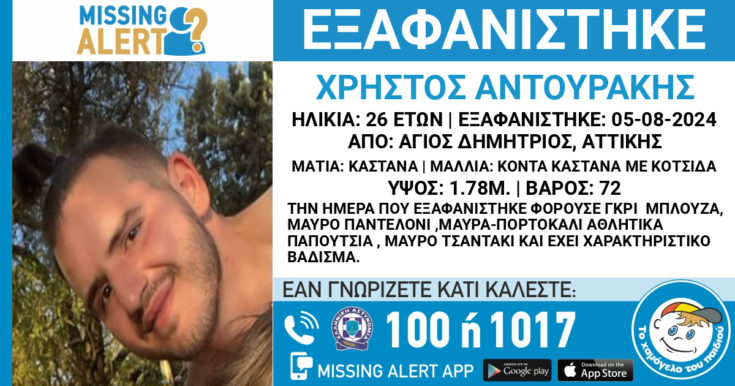 Missing Alert για 26χρονο, που εξαφανίστηκε το πρωί της Δευτέρας (5/8) από την περιοχή του Αγίου Δημητρίου στην Αθήνα.