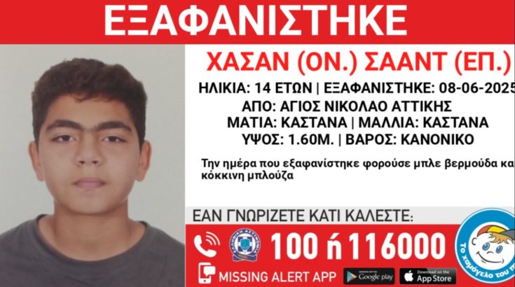 Συναγερμός έχει σημάνει για την εξαφάνιση ενός 14χρονου, αιγυπτιακής καταγωγής, στον Άγιο Νικόλαο, από χώρο φιλοξενίας ασυνόδευτων ανηλίκων, το απόγευμα της Κυριακής (08/06).