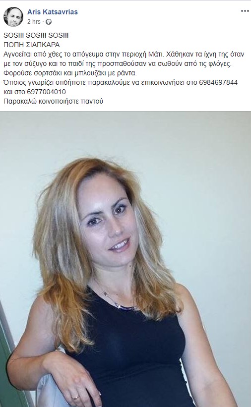 “Αγνοείται από χθες το απόγευμα στην περιοχή Μάτι. Χάθηκαν τα ίχνη της όταν με τον σύζυγο και το παιδί της προσπαθούσαν να σωθούν από τις φλόγες. Φορούσε σορτσάκι και μπλουζάκι με ράντα. Όποιος γνωρίζει οτιδήποτε παρακαλούμε να επικοινωνήσει στο 6984697844 και στο 6977004010 Παρακαλώ κοινοποιήστε παντού”