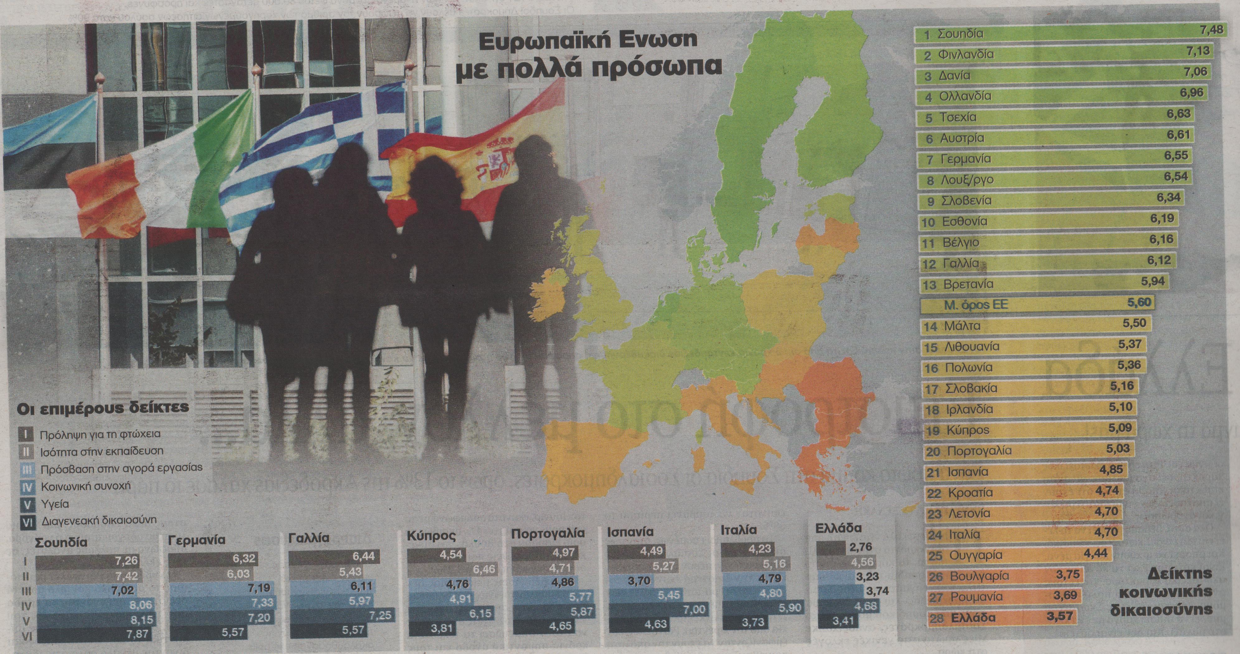 Το αποτέλεσμα για την Ελλάδα είναι αποκαλυπτικό. Είναι τελευταία στην κατάταξη των 28 χωρών της ΕΕ και δεν συγκεντρώνει ούτε τους μισούς από τους πόντους της Σουηδίας που είναι πρώτη στην κατάταξη κοινωνικής δικαιοσύνης.