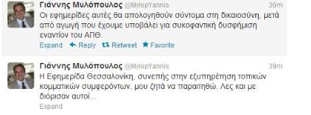 Το δρόμο της δικαιοσύνης επιλέγει ο πρύτανης του Αριστοτελείου Πανεπιστημίου Θεσσαλονίκης Γιάννης Μυλόπουλος. Οπως ενημέρωσε, μέσω twitter, θα καταθέσει αγωγές εναντίον των εφημερίδων Μακεδονία και Θεσσαλονίκη, για συκοφαντική δυσφήμηση εναντίον του ΑΠΘ.