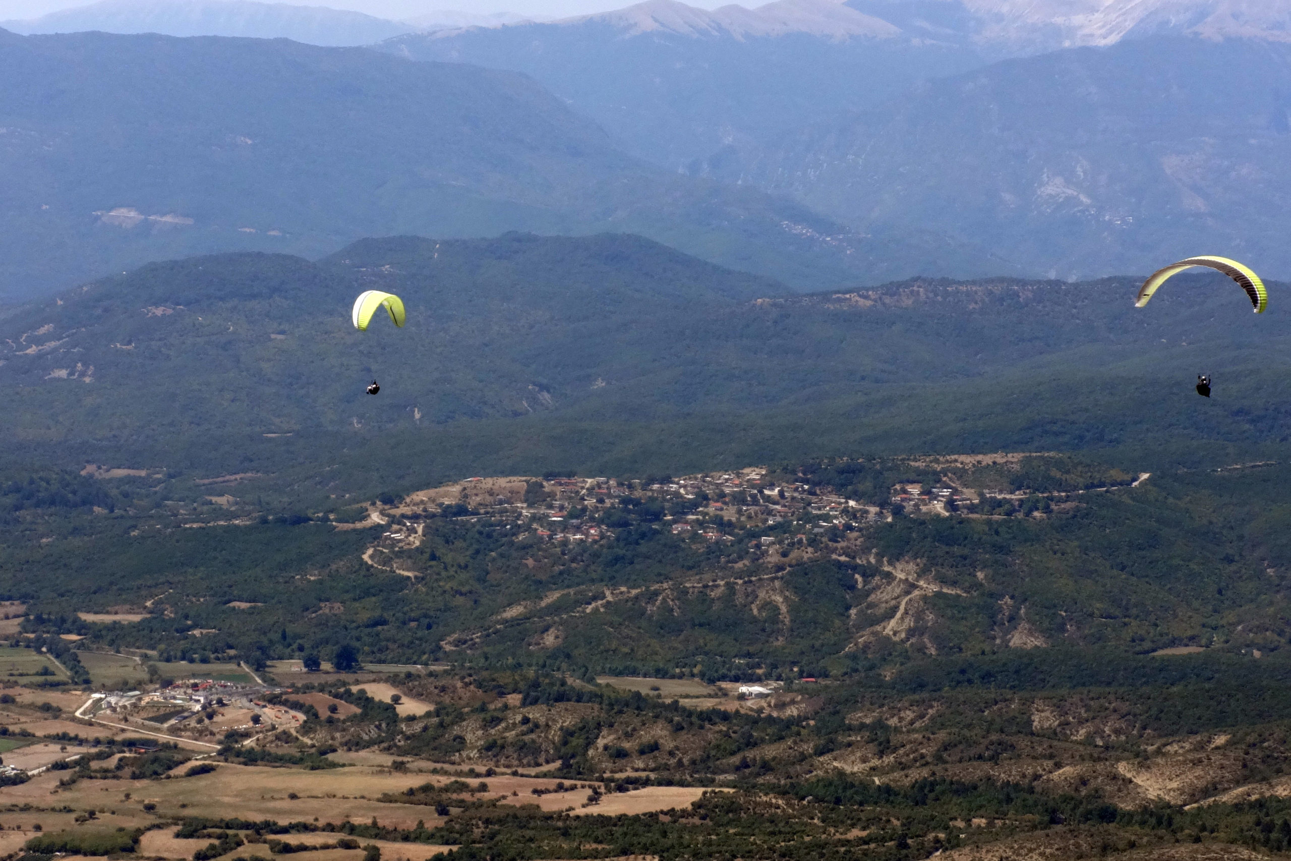 Ο καιρός είναι ευνοϊκός και το πέταγμα των αλεξίπτωτων γίνεται από την κορυφή του Προφήτη Ηλία, που βρίσκεται πάνω από την κωμόπολη.