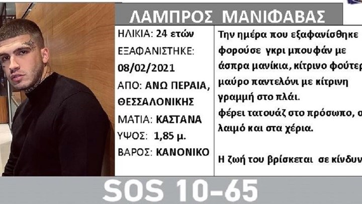 Η γιαγιά του 24χρονου υπέβαλε τη δήλωση εξαφάνισης στην Αστυνομία. Έτσι ενεργοποιήθηκαν και επίσημα οι μηχανισμοί για τον εντοπισμό του νεαρού ράπερ. Την Τετάρτη ενεργοποιήθηκε ο μηχανισμός του Silver Alert, σύμφωνα με τον οποίο, πρόκειται για τον Λάμπρο Μανιφάβα, 24 ετών. Εξαφανίστηκε από το σπίτι του στην περιοχή Ραντάρ, στην Άνω Περαία Θεσσαλονίκης. Έχει καστανά μάτια, ύψος 1,85μ και είναι κανονικού βάρους. Την ημέρα που εξαφανίστηκε φορούσε γκρι μπουφάν με άσπρα μανίκια, κίτρινο φούτερ και μαύρο παντελόνι με κίτρινη γραμμή στο πλάι. Φέρει τατουάζ στο πρόσωπο, στον λαιμό και στα χέρια. Το καλλιτεχνικό του όνομα είναι Lamanif. Παράλληλα, κυκλοφόρησε ένα βίντεο στα μέσα κοινωνικής δικτύωσης με την υποσημείωση ότι στα πλάνα εμφανίζεται ο αγνοούμενος ράπερ. Το βίντεο έχει τραβηχτεί στην οδό Τσιμισκή μέσα από αυτοκίνητο το οποίο βρίσκεται εν κινήσει και δεν μπορεί να διαπιστωθεί με ακρίβεια εάν το άτομο που φαίνεται στο βίντεο είναι ο Lamanif.