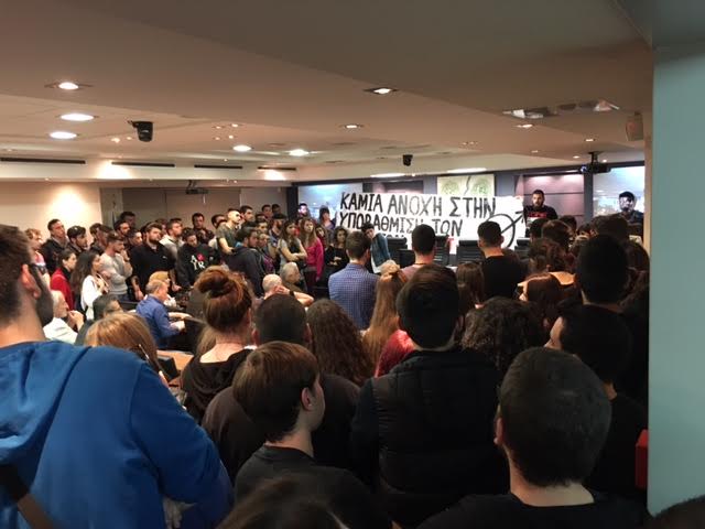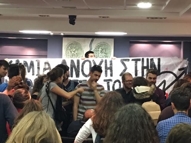 Οι φοιτητές μπήκαν στην αίθουσα φωνάζοντας συνθήματα και κρατώντας πανό, ενώ ζητούν μεταξύ άλλων, «να μην υποβαθμιστούν τα πανεπιστημιακά τμήματα του Αγρινίου».