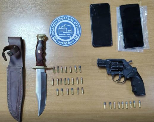 Στην κατοχή του συλληφθέντα οι αστυνομικοί της Υποδιεύθυνσης Ασφάλειας Αγρινίου βρήκαν και κατέσχεσαν ένα περίστροφο οπλισμένο με εννέα φυσίγγια, ένα μαχαίρι, 21 ακόμη φυσίγγια και δύο κινητά τηλέφωνα.