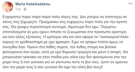 Η Μαρία Κατσικαδάκου επανήλθε σήμερα με νέα ανάρτηση στο Facebook ευχαριστώντας παράλληλα τους διαδικτυακούς της φίλους για τη συμπαράσταση.