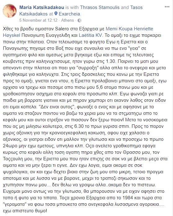 “Χθες το βράδυ ήμασταν Salero στα Εξάρχεια με Memi Koupa Henriette Høyskel Παναγιώτη Ευαγγελίδη και Laëtitia KV. Το αμάξι το είχαμε παρκάρει πάνω στην πλατεία. Όταν τελειώσαμε το φαγητό εγώ η Εριέττα και ο Παναγιώτης πήγαμε στο Βοξ που είχε συναυλία να πω ένα “γεια” σε αγαπημένο φίλο και αμέσως μετά βγήκαμε έξω και είπαμε τις τελευταίες κουβέντες πριν καληνυχτίσουμε, ήταν γύρω στις 1.30. Παίρνει το μάτι μου απέναντι στην πλατεία ότι πάει για “σύρραξη” αλλά απλά το ανέφερα και μετά φιληθήκαμε για καληνύχτα. Στις τρεις δρασκελιές που κάνω με την Εριέττα προς το αμάξι, γίνεται ένα ντου, η Εριέττα προλαβαίνει μπαίνει στο αμάξι, εγώ άρχισα να τρέχω και πέσαμε από πίσω μου 5,6 άτομα πάνω μου και με γρονθοκόπησαν άσχημα στο κεφάλι στο πρόσωπο κλπ. Εγώ φώναζα γιατί ρε παιδιά μη βαράτε γιατί και με πήραν χαμπάρι ότι έκαναν λάθος όταν είδαν ότι είμαι κοπέλα. “Δεν είναι αυτός”, φώναξε ο ένας και με αφήσανε με τα αίματα να στάζουν παντού να βάζω τα χεριά μου να τα σταματήσω από το κεφάλι μου και αυτοί έτρεξαν να πιάσουν δεν ξέρω ποιον! Μετά τα νοσοκομεία που ας μη μιλήσω καλύτερα, στις 6.30 το πρωί γύρισα σπίτι. Προς το παρόν χωρίς αξονική για την κρανιοεγκεφαλική κάκωση, αφού είχε χαλάσει ο αξονικός, οι γιατροί είδαν ότι μάλλον την γλίτωσα και να προσέχω το πρώτο 24ωρο μην έχω εμετούς, υπνηλία κλπ. Όσο ανελέητο γρονθοκόπημα έφαγα κυρίως στο κεφάλι άλλη τόση αγάπη πήρα χθες από τον Θράσσο μου, τον Τασούλη μου, την Εριέττα μου που ήταν επίσης σε σοκ να με βλέπει μέσα στα αίματα και να μην ξέρει τι έγινε. Δεν έχω λόγια, είμαι ακόμα σε σοκ ψυχολογικά, αν και έχω δεχτεί βίαια στην ζωή μου από μικρή, τέτοιο πράγμα απότομα και με λύσσα να με βαράνε, μέχρι το τραπέζι σήκωσαν και το χτύπησαν πάνω μου… δεν θέλω να γράψω αλλά..ακόμα δεν το πιστεύω. Εύχομαι μόνο όντως να την γλίτωσα, θα μπορούσαν να με είχαν αφήσει στο τόπο ή φυτό για το τίποτα. Τόσα χρόνια Εξάρχεια από το 1984 και τώρα στα “γεράματα” να φάω τόσα μπουκέτα από ανεγκέφαλα λυσσασμένα αγοράκια…. έχω απίστευτο θύμο!”