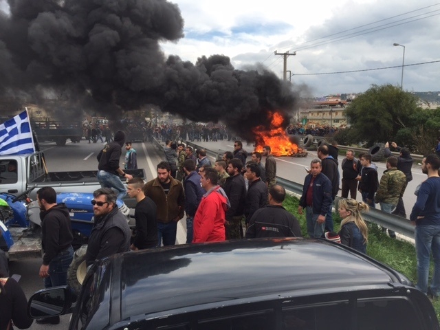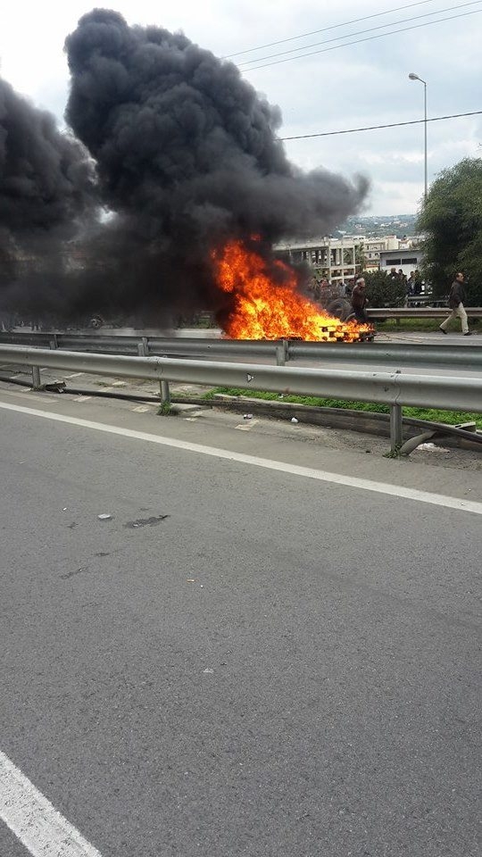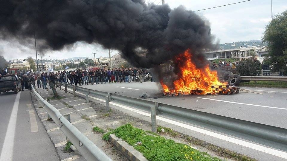 Αγρότες καίνε λάστιχα στο ύψος του κόμβου στο Γιόφυρο, όπου βρίσκονται μαζί και με όσους συμμετέχουν στις σημερινές κινητοποιήσεις του Ηρακλείου στο πλαίσιο της γενικής απεργίας ενάντια στο Ασφαλιστικό.