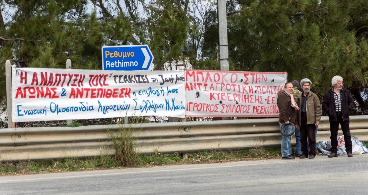 Σε ολιγόλεπτο συμβολικό αποκλεισμό της εθνικής οδού Χανίων- Ρεθύμνου στο ύψος της περιοχής «Μεγάλα Χωράφια», προχώρησαν το μεσημέρι της Κυριακής αγρότες και κτηνοτρόφοι, μέλη της Ενωτικής Ομοσπονδίας Αγροτικών Συλλόγων Χανίων.