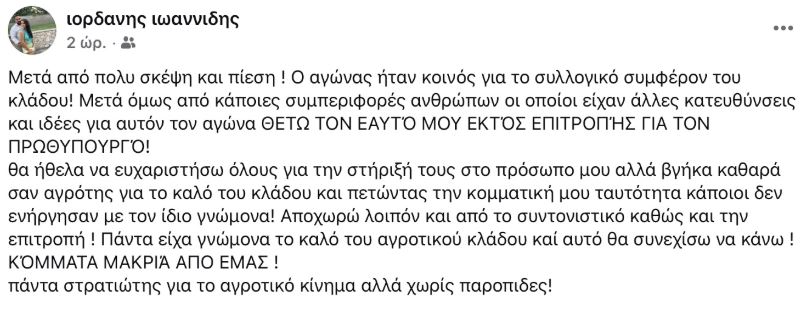 Αναλυτικά, η ανάρτηση του κ. Ιωαννίδη αναφέρει τα εξής: «Μετά από πολλή σκέψη και πίεση! Ο αγώνας ήταν κοινός για το συλλογικό συμφέρον του κλάδου! Μετά όμως από κάποιες συμπεριφορές ανθρώπων οι οποίοι είχαν άλλες κατευθύνσεις και ιδέες για αυτόν τον αγώνα ΘΕΤΩ ΤΟΝ ΕΑΥΤΟ ΜΟΥ ΕΚΤΟΣ ΕΠΙΤΡΟΠΗΣ ΓΙΑ ΤΟΝ ΠΡΩΘΥΠΟΥΡΓΟ! Θα ήθελα να ευχαριστήσω όλους για την στήριξή τους στο πρόσωπό μου αλλά βγήκα καθαρά σαν αγρότης για το καλό του κλάδου και πετώντας την κομματική μου ταυτότητα κάποιοι δεν ενήργησαν με τον ίδιο γνώμονα! Αποχωρώ λοιπόν και από το συντονιστικό καθώς και την επιτροπή! Πάντα είχα γνώμονα το καλό του αγροτικού κλάδου και αυτό θα συνεχίσω να κάνω! ΚΟΜΜΑΤΑ ΜΑΚΡΙΑ ΑΠΟ ΕΜΑΣ! πάντα στρατιώτης για το αγροτικό κίνημα αλλά χωρίς παρωπίδες!».