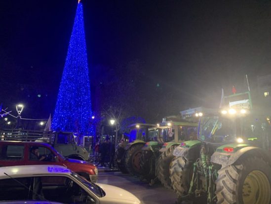 Η εικόνα της κεντρικής πλατείας ήταν πρωτόγνωρη, καθώς είναι στολισμένη χριστουγεννιάτικα και ταυτόχρονα γεμάτη τρακτέρ, αλλά και με πανό και διαδηλωτές.