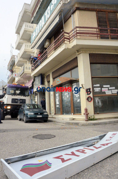 Ανέβηκαν σε ένα φορτηγό και από εκεί πήδηξαν στο μπαλκόνι όπου στεγάζοντα τα γραφεία του ΣΥΡΙΖΑ, ξηλώνοντας την πινακίδα και πετώντας την στο δρόμο. Έπειτα, πέταξαν ελιές και πορτοκάλια στην είσοδο των γραφείων.