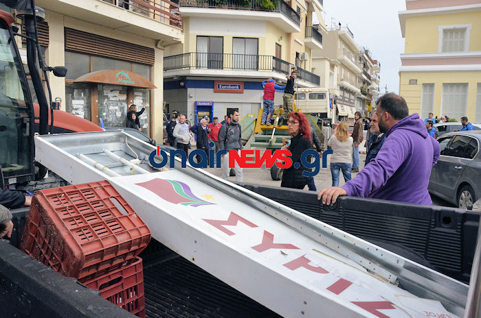 Οι αγρότες πήγαν αρχικά στη Μητρόπολη προϊόντα με σκοπό να διατεθούν στο συσσίτιο για άπορους. Στην συνέχεια μετέβησαν στην κεντρική πλατεία με σκοπό να κοινοποιήσουν τα αιτήματα τους στα γραφεία του ΣΥΡΙΖΑ. Όμως, διαπίστωσαν ότι η κεντρική πόρτα της πολυκατοικίας όπου στεγάζονται τα γραφεία ήταν κλειδωμένη και υπήρχε αστυνομική δύναμη. Ένας συνεργάτης της βουλευτή του ΣΥΡΙΖΑ Μαρίας Τριανταφύλλου, τους ενημέρωσε πως έχει εντολή να μην ανοίξει την πόρτα σε κανένα. Τότε, τα αίματα άναψαν και οι αγρότες πήγαν πίσω στο μπλόκο και επέστρεψαν με… τρακτέρ.