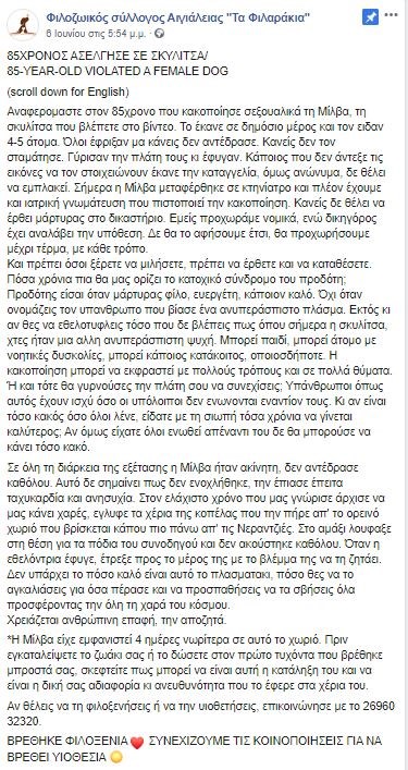 Οργή και αποτροπιασμό προκαλεί η καταγγελία του Φιλοζωικού Συλλόγου Αιγιάλειας, “Τα φιλαράκια” για έναν ηλικιωμένο, περίπου 85 ετών, που φέρεται να κακοποίησε σεξουαλικά μια σκυλίτσα σε ορεινό χωριό της Αιγιάλειας, κοντά στις Νεραντζιές. Σύμφωνα με την καταγγελία, το περιστατικό σημειώθηκε σε δημόσιο χώρο, μπροστά στα μάτια περαστικών, οι οποίοι όμως δεν αντέδρασαν.