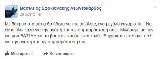 «Με δάκρυα στα μάτια θα ήθελα να πω σε όλους ένα μεγάλο ευχαριστώ… Να είστε όλοι καλά για την αγάπη και την συμπαράσταση σας.. Μιλήσαμε με των γιο μου Βασίλη και το βασικό είναι ότι είναι καλά.. Ευχαριστώ πολύ και πάλι για την αγάπη και την συμπαράσταση σας».