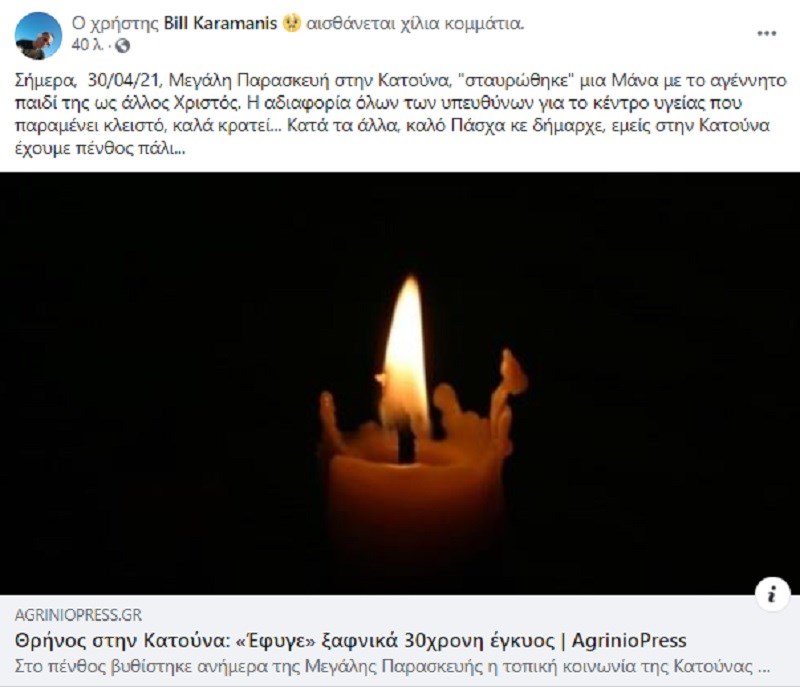 “Σήμερα, 30/04/21, Μεγάλη Παρασκευή στην Κατούνα, “σταυρώθηκε” μια Μάνα με το αγέννητο παιδί της ως άλλος Χριστός. Η αδιαφορία όλων των υπευθύνων για το κέντρο υγείας που παραμένει κλειστό, καλά κρατεί… Κατά τα άλλα, καλό Πάσχα κε δήμαρχε, εμείς στην Κατούνα έχουμε πένθος πάλι…” έγραψε.