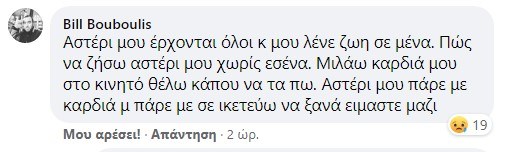«Αστέρι μου έρχονται όλοι κ μου λένε ζωή σε μένα. Πώς να ζήσω αστέρι μου χωρίς εσένα; Μιλάω καρδιά μου στο κινητό θέλω κάπου να τα πω. Αστέρι μου πάρε με καρδιά μου πάρε με σε ικετεύω να ξανά είμαστε μαζί», έγραψε.