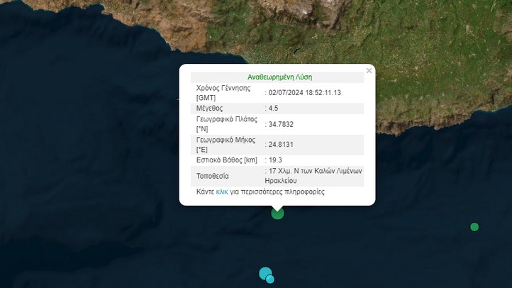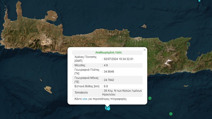Ο πρώτος σεισμός σύμφωνα με την ανάλυση του Γεωδυναμικού Ινστιτούτου είχε μέγεθος 4,5 Ρίχτερ και είχε επίκεντρο 16 χλμ, νότια των Καλών Λιμένων Ηρακλείου, ενώ είχε εστιακό βάθος 19,6 χλμ.