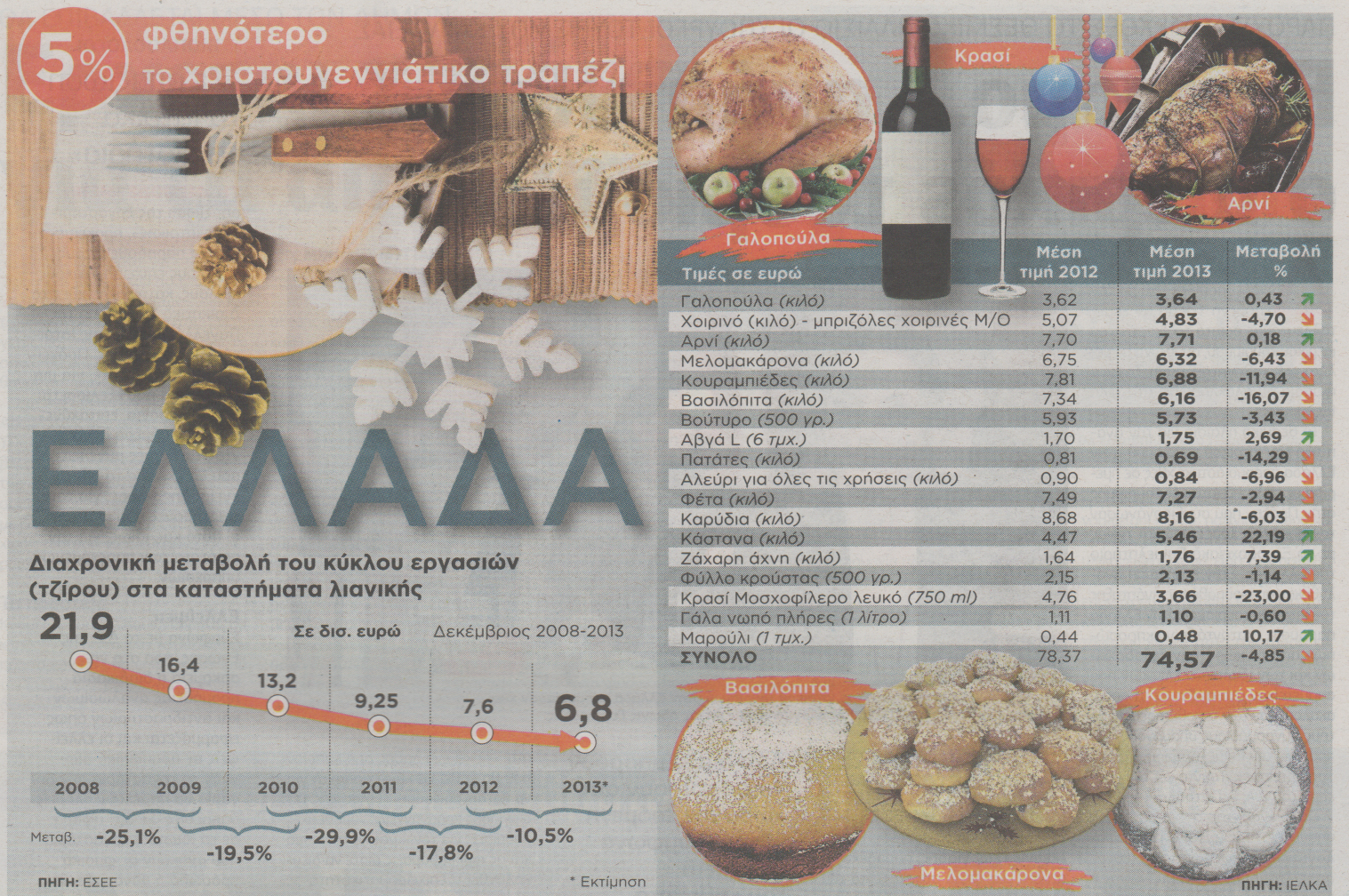 Φθηνότερες σε σχέση με πέρσι, αλλά απλησίαστες για εκατοντάδες χιλιάδες Έλληνες χωρίς εισοδήματα, είναι οι τιμές των περισσότερων από τα είδη που συνθέτουν ένα χριστουγεννιάτικο τραπέζι. Ακριβότερη είναι η γαλοπούλα, φθηνότεροι οι κουραμπιέδες και τα μελομακάρονα. Από τον εορταστικό τζίρο χάθηκαν ση διάρκεια της κρίσης 15 δισ. ευρώ! Ο εορταστικός τζίρος των καταστημάτων μειώθηκε στο 1/3 σε σχέση με το 2008.