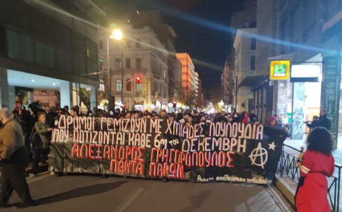 Ξεκίνησε η απογευματινή πορεία από σωματεία, συλλογικότητες και φορείς για την συμπλήρωση των 15 ετών από την δολοφονία του Αλέξανδρου Γρηγορόπουλου στα Προπύλαια.